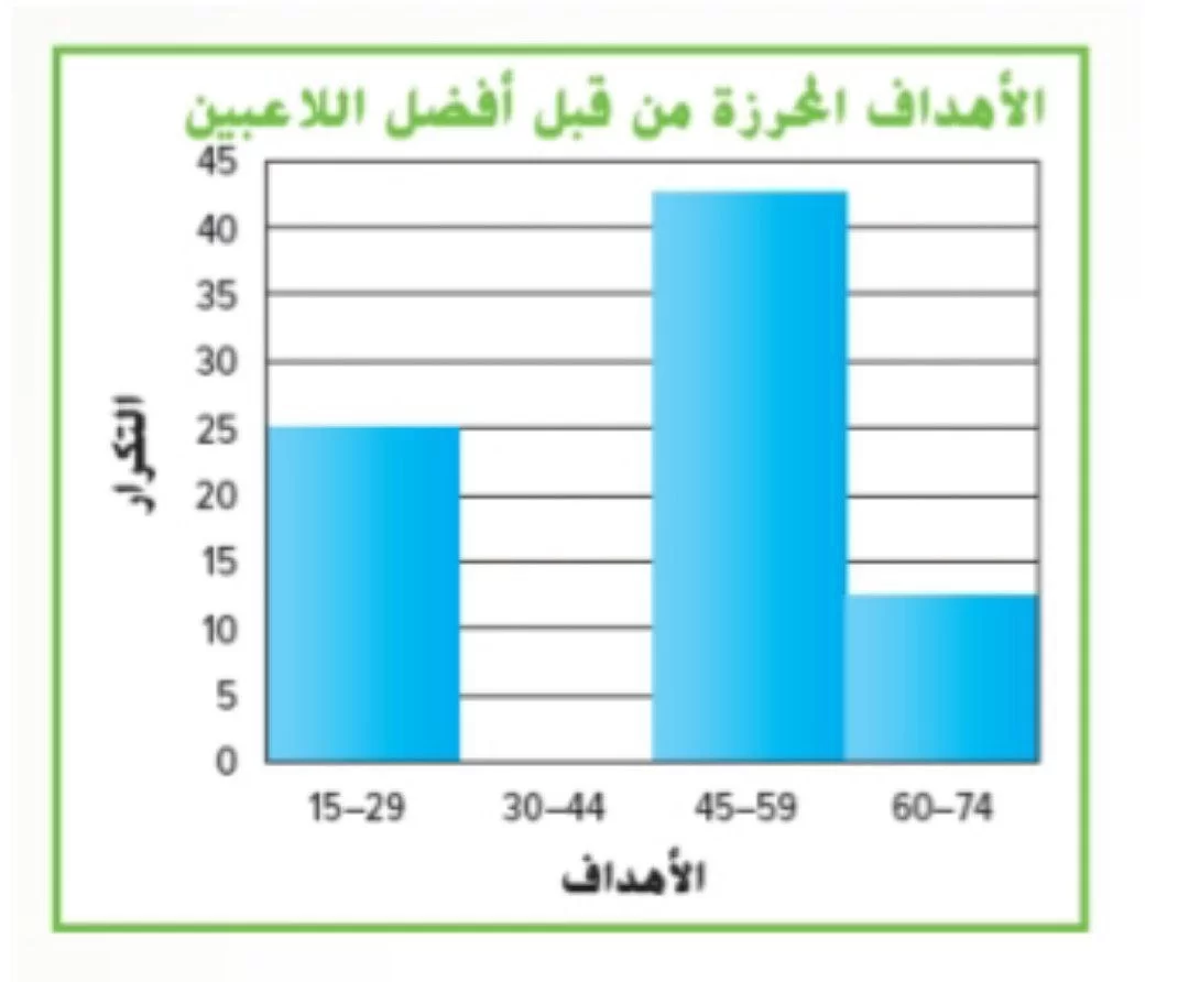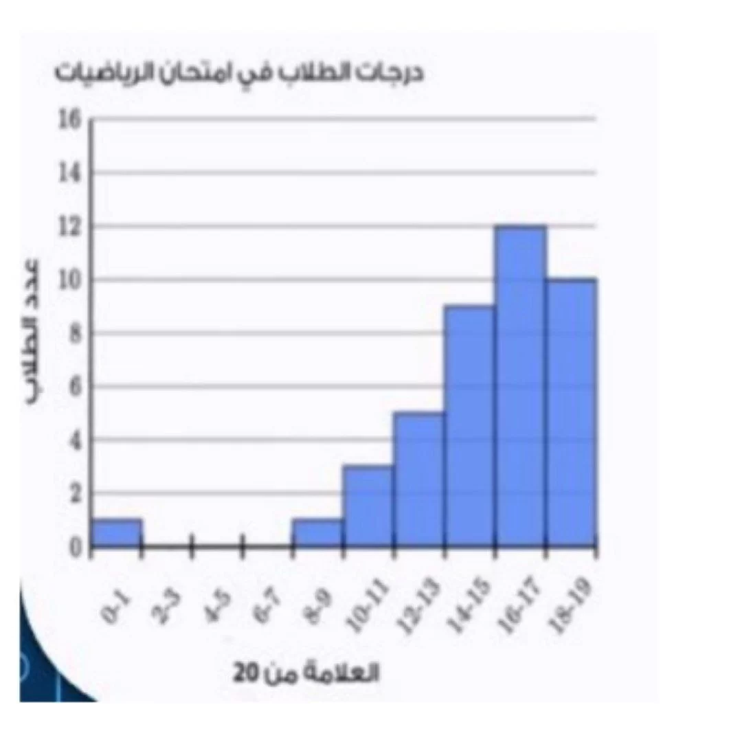 في المدرج التكراري لدرجات الرياضيات، تظهر الفئة 0-1 كفئة معزولة ومنخفضة جداً وبعيدة عن تجمع الدرجات الرئيسي، مما يجعلها قيمة متطرفة.