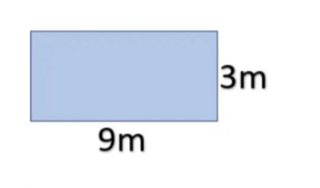 مساحة المستطيل تساوي الطول في العرض. بتطبيق القانون: \(9 \times 3 = 27 m^2\).