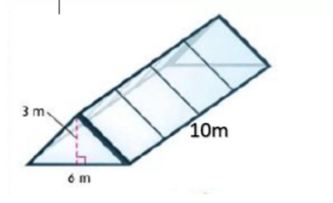 مساحة سطح المنشور تساوي مجموع مساحات أوجهه (قاعدتان مثلثتان و3 أوجه مستطيلة). مساحة القاعدتين = \(2 \times (\frac{1}{2} \times 6 \times 3) = 18\). المساحة الجانبية (باعتبار أضلاع المثلث 6) = \((6+6+6) \times 10 = 180\). المجموع = \(18 + 180 = 198 m^2\).