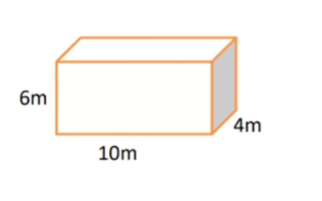 من خلال أبعاد الشكل الموضح: الطول 10m، العرض 4m، والارتفاع 6m. الحجم = \(10 \times 4 \times 6 = 240\).