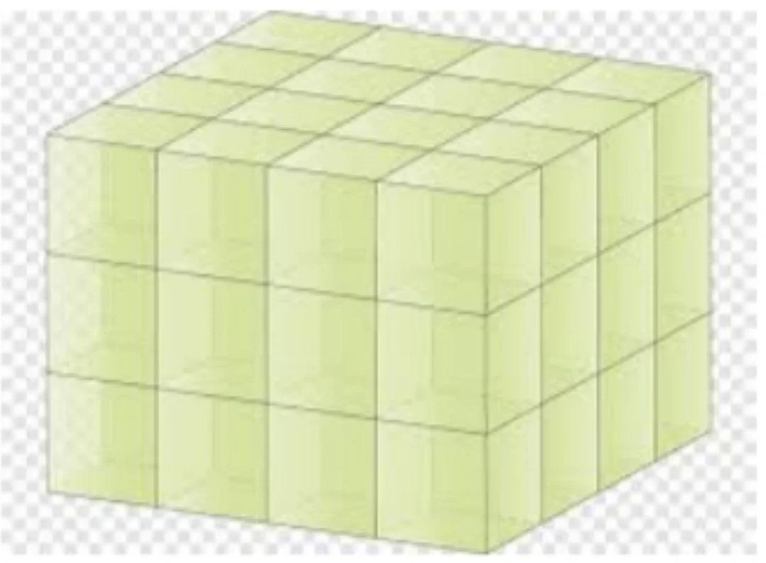 من خلال عد الوحدات في الشكل: الطول 4، العرض 3، والارتفاع 4. الحجم = \(4 \times 3 \times 4 = 48\).