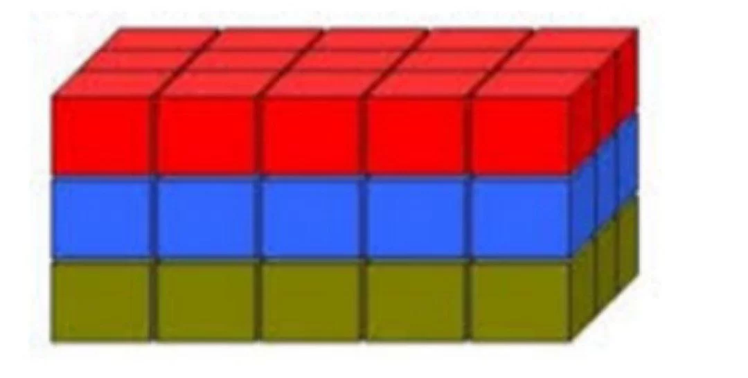 حجم المنشور المستطيل يساوي الطول × العرض × الارتفاع، وبناءً عليه: \(5 \times 2 \times 3 = 30\).