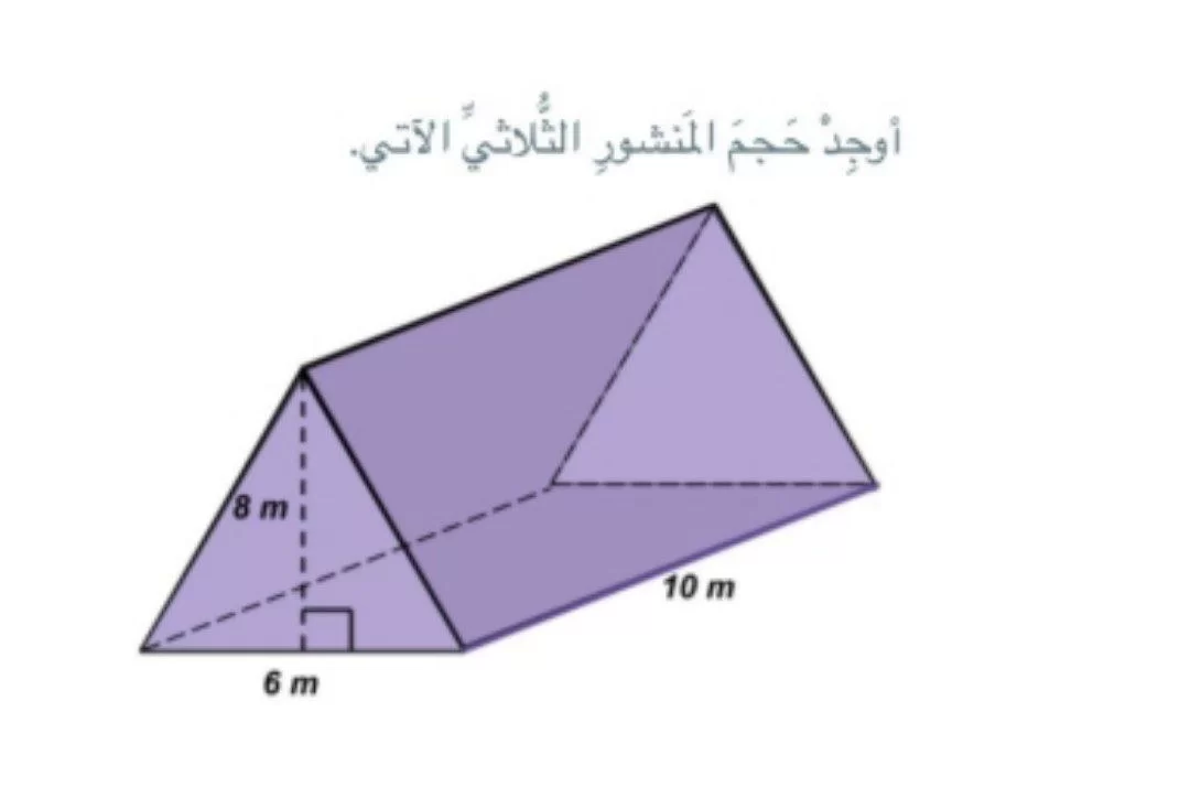 حجم المنشور الثلاثي = مساحة القاعدة \times الارتفاع. مساحة القاعدة المثلثة = \frac{1}{2} \times 6 \times 8 = 24. إذن الحجم = 24 \times 10 = 240.