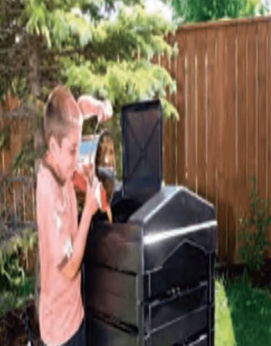 تظهر الصورة حاوية لعملية التسميد العضوي (Composting) التي يتم فيها تحويل بقايا الطعام والمواد العضوية إلى سماد للتربة.