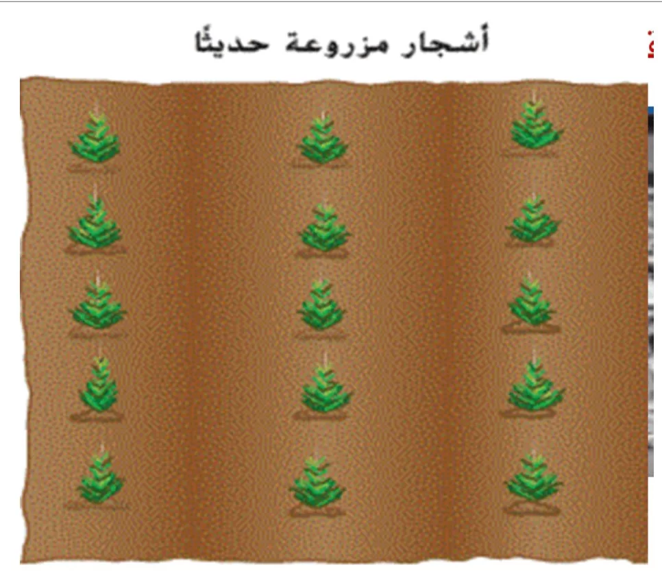تظهر الصورة غرس أشجار جديدة بشكل منظم، وهي عملية تسمى إعادة التشجير لتعويض الغابات المفقودة.