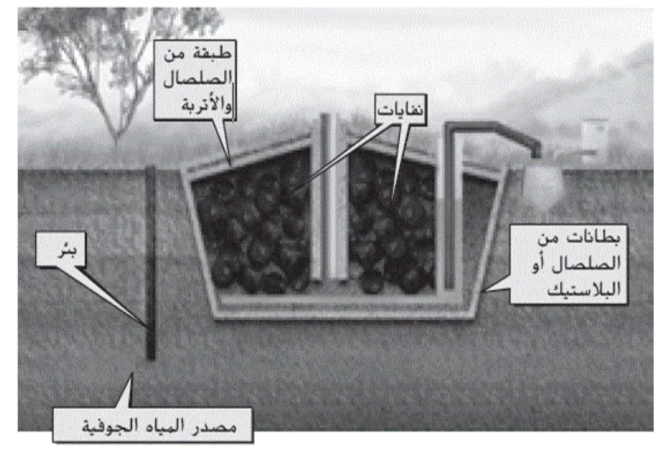في تصميم مكبات النفايات الحديثة، يتم حفر آبار حول المكب لمراقبة عينات المياه الجوفية والتأكد من عدم وجود تسرب للملوثات.