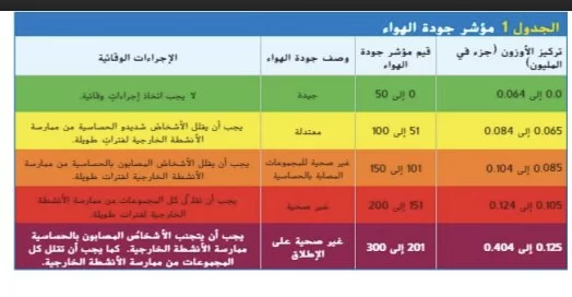 المقياس الموضح في الجدول يبدأ من القيمة 0 وينتهي عند القيمة التي تزيد عن 201 لتصل لـ 300 في التصنيفات التحذيرية.