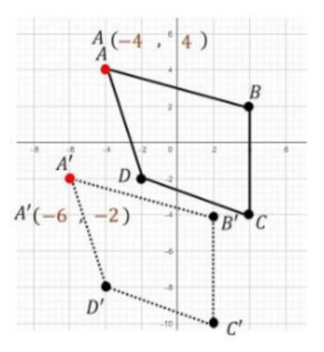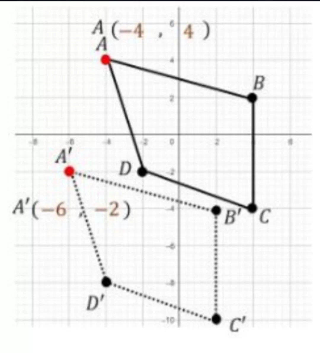بالنظر إلى إحداثيات النقطة A عند (4, -4) وانتقالها إلى A' عند (-2, -6)، نلاحظ أن قيم y تناقصت من 4 إلى -2، مما يعني التحرك للأسفل.