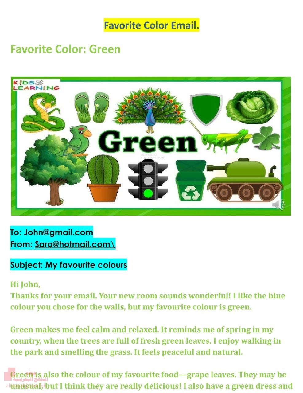 معلومات الملف: سأقوم بتحليل محتوى رسائل البريد الإلكتروني حول الألوان المفضلة وفقًا لطلبك، مع الالتزام بالترقيم والتبويب دون استخدام أي علامات خاصة (هاشتاغ، نجوم، علامات اقتباس، إلخ). * بريد سارة (اللون المفضل: الأخضر) * البريد موجه إلى جون. * المرسل: سارة. * الموضوع: ألواني المفضلة. * اللون المفضل هو الأخضر. * الشعور الذي يثيره الأخضر: يجعلها تشعر بالهدوء والاسترخاء. * ما يذكرها به اللون: يذكرها بالربيع في بلدها، عندما تكون الأشجار مليئة بالأوراق الخضراء النضرة. * الأنشطة المرتبطة: تستمتع بالمشي في الحديقة وشم العشب. * الإحساس العام: شعور بالسلام والطبيعة. * الطعام المفضل المرتبط باللون: ورق العنب. تعتبره لذيذًا على الرغم من أنه قد يكون غير عادي. * الأشياء الشخصية الخضراء: لديها فستان أخضر ووشاح أخضر، وتحب أن ترتديهما في الربيع. * الطلب الختامي: تطلب من جون إرسال صور لغرفته عندما تكون جاهزة. * بريد عمر (اللون المفضل: الأحمر) * البريد موجه إلى جون. * المرسل: عمر. * الموضوع: ألواني المفضلة. * اللون المفضل هو الأحمر. * وصف اللون الأحمر: لون قوي ومشرق. * الشعور الذي يثيره الأحمر: يجعله يشعر بالحماس والمليء بالطاقة. * ما يذكره به اللون: يذكره بالزهور الجميلة في الصيف والنار الدافئة في الشتاء. * الإحساس العام: كلاهما يعطيه شعوراً بالسعادة. * الطعام المفضل المرتبط باللون: الفراولة. يصفها بأنها حلوة ولذيذة ولا يمكنه الاكتفاء منها. * الأشياء الشخصية الحمراء: يحب سترته الحمراء. يذكر أنها تبقيه دافئًا في الشتاء وتجعله يشعر بالقوة. * الطلب الختامي: يطلب من جون ألا ينسى أن يرسل له صورًا لغرفته. * بريد لينا (اللون المفضل: الأصفر) * البريد موجه إلى جون. * المرسل: لينا. * الموضوع: ألواني المفضلة. * اللون المفضل هو الأصفر. * وصف اللون الأصفر: لون مشرق ومبهج. * الشعور الذي يثيره الأصفر: يجعلها تبتسم دائمًا وتشعر بالسعادة. * ما يذكرها به اللون: يذكرها بالشمس المشرقة في الصيف وعباد الشمس الكبيرة في حديقة جدتها. * الطعام المفضل المرتبط باللون: شوربة الذرة المفضلة لديها. تصفها بأنها دافئة وكريمية وتجعلها تشعر بالرضا. * الأشياء الشخصية الصفراء: تي شيرت أصفر. تصفه بأنه المفضل لديها لأنه مشرق وسعيد، وسترتديه في الصيف. * الطلب الختامي: تطلب من جون أن يريها غرفته الجديدة قريبًا. * بريد ديفيد (اللون المفضل: الأزرق) * البريد موجه إلى جون. * المرسل: ديفيد. * الموضوع: ألواني المفضلة. * اللون المفضل هو الأزرق. * الشعور الذي يثيره الأزرق: يجعله يشعر بالهدوء والأمان. * ما يذكره به اللون: يذكره بالبحر والسماء الصافية في يوم مشمس. * الأنشطة المرتبطة: يجلس أحيانًا في الخارج ويشاهد السماء الزرقاء. * الإحساس العام: يجعله يشعر بالسلام الداخلي. * الطعام المفضل المرتبط باللون: التوت الأزرق (Blueberries). يصفه بأنه صغير ولكنه مليء بالنكهة الحلوة. * الأشياء الشخصية الزرقاء: يحب بنطاله الجينز الأزرق. يصفه بأنه مريح ويرتديه كل يوم تقريبًا. * الطلب الختامي: يود رؤية المزيد من الصور لغرفة جون عندما تكون جاهزة. * بريد هناء (اللون المفضل: البنفسجي/الأرجواني) * البريد موجه إلى جون. * المرسل: هناء. * الموضوع: ألواني المفضلة. * اللون المفضل هو البنفسجي (Purple). * وصف اللون البنفسجي: لون خاص وجميل. * الشعور الذي يثيره البنفسجي: يجعلها تشعر بالإبداع والتفرد. * ما يذكرها به اللون: يذكرها بسماء المساء وزهور اللافندر في الحقول. * الإحساس العام: لون يجعلها تحلم دائمًا. * الطعام المفضل المرتبط باللون: الخوخ (Plums). تصفه بأنه حلو وعصيري، وتستمتع بأكله في الصيف. * الأشياء الشخصية البنفسجية: لديها سترة بنفسجية. تصفها بأنها ناعمة ودافئة وترتديها في الأمسيات الباردة. * الطلب الختامي: تطلب من جون إرسال صور لغرفته عندما يستطيع. * بريد بوب (اللون المفضل: البرتقالي) * البريد موجه إلى جون. * المرسل: بوب. * الموضوع: ألواني المفضلة. * اللون المفضل هو البرتقالي. * وصف اللون البرتقالي: لون دافئ ومشرق. * الشعور