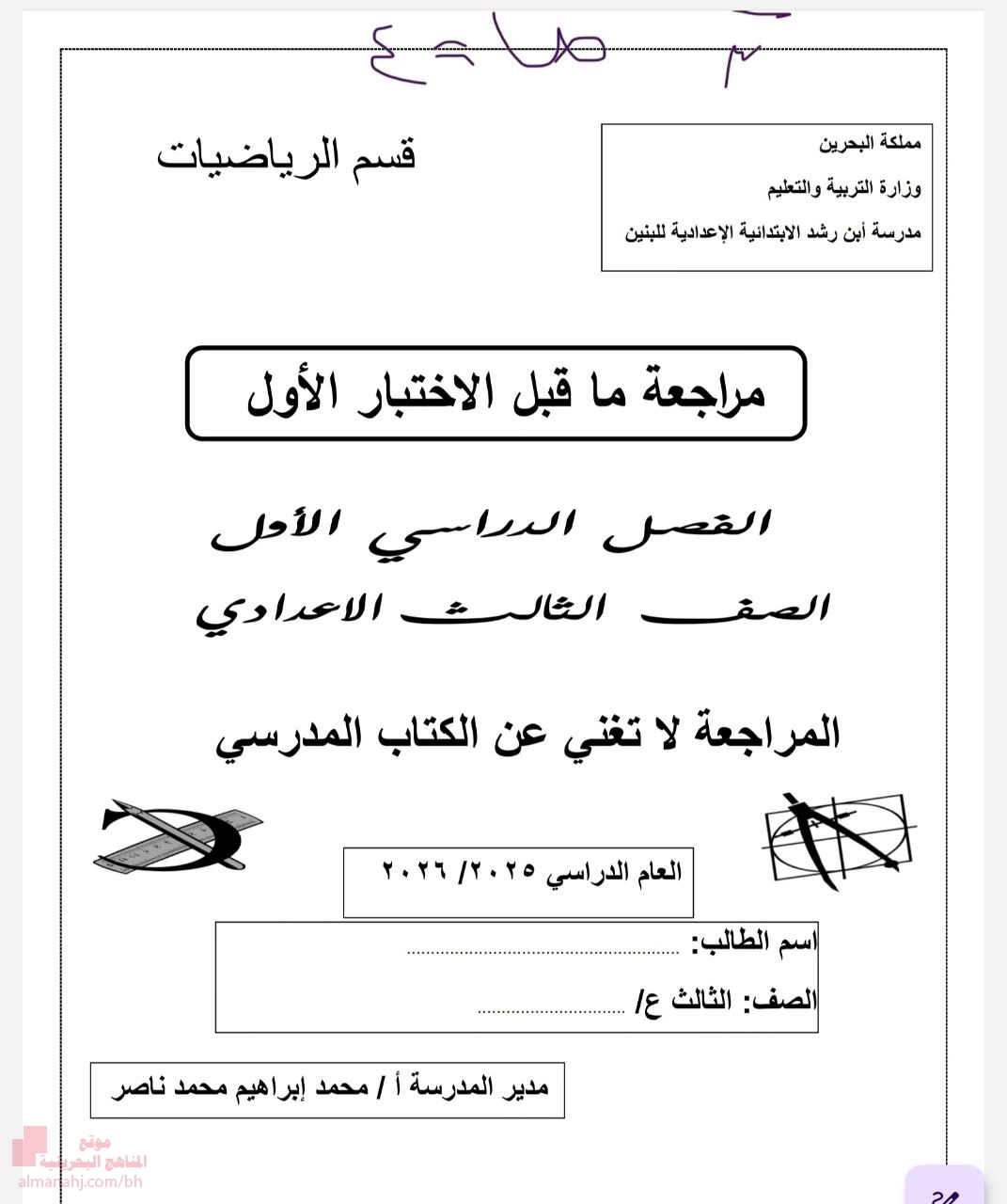 مراجعة الاختبار الأول الرياضيات, الصف التاسع, رياضيات, الفصل الأول, 2025-2026 | ||