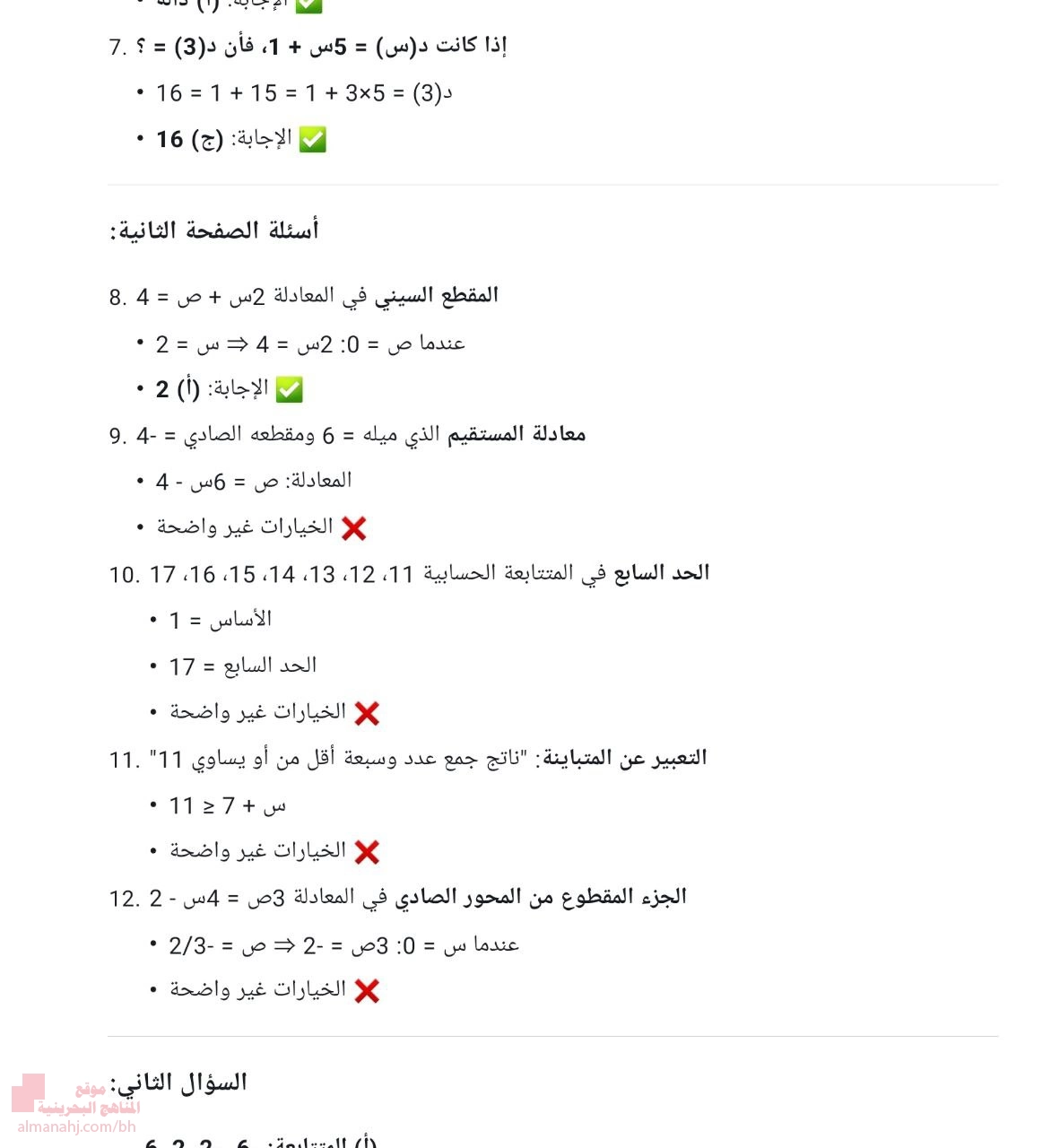 معلومات الملف: السؤال الأول: اختر الإجابة الصحيحة 1. مجال الدالة من العلاقة: ع = {(3،5)، (4،6)، (5،7)} · المجال = {3، 4، 5} · ✅ الإجابة: (ج) {3، 4، 5} 2. ميل المستقيم الرأسي · ميل المستقيم الرأسي غير معرف · ✅ الإجابة: (د) غير معرف 3. المتغير المستقل في جملة "يزداد ضغط الهواء داخل إطار سيارة عند ازدياد درجة الحرارة" · المتغير المستقل هو درجة الحرارة · ✅ الإجابة: (ب) درجة الحرارة 4. الحد النوني في المتتابعة: 1، 8، 15، 22، ... · الأساس = 7 · الحد النوني = 7ن - 6 · ✅ الإجابة: (ج) 7ن - 6 5. ميل المستقيم المار بالنقطتين (4،7)، (5،13) · الميل = (13-7)/(5-4) = 6/1 = 6 · ✅ الإجابة: (د) 6 6. العلاقة: ع = {(8،3)، (5،1)، (4،-1)} · كل عنصر في المجال له صورة واحدة → دالة · ✅ الإجابة: (أ) دالة 7. إذا كانت د(س) = 5س + 1، فأن د(3) = ؟ · د(3) = 5×3 + 1 = 15 + 1 = 16 · ✅ الإجابة: (ج) 16 --- أسئلة الصفحة الثانية: 1. المقطع السيني في المعادلة 2س + ص = 4 · عندما ص = 0: 2س = 4 ⇒ س = 2 · ✅ الإجابة: (أ) 2 2. معادلة المستقيم الذي ميله = 6 ومقطعه الصادي = -4 · المعادلة: ص = 6س - 4 · ❌ الخيارات غير واضحة 3. الحد السابع في المتتابعة الحسابية 11، 12، 13، 14، 15، 16، 17 · الأساس = 1 · الحد السابع = 17 · ❌ الخيارات غير واضحة 4. التعبير عن المتباينة: "ناتج جمع عدد وسبعة أقل من أو يساوي 11" · س + 7 ≤ 11 · ❌ الخيارات غير واضحة 5. الجزء المقطوع من المحور الصادي في المعادلة 3ص = 4س - 2 · عندما س = 0: 3ص = -2 ⇒ ص = -2/3 · ❌ الخيارات غير واضحة --- السؤال الثاني: (أ) المتتابعة: -6، -2، 2، 6، ... · الأساس = 4 · الحد النوني = -6 + (ن-1)×4 = 4ن - 10 · الحد الحادي والعشرين: 4×21 - 10 = 84 - 10 = 74 (ب) حل المتباينة: 5س - 32 ≥ 12 · 5س ≥ 44 · س ≥ 8.8 · التمثيل على خط الأعداد: نقطة مغلقة عند 8.8 وسهم نحو اليمين (ج) ميل المستقيم المار بالنقطتين (7،10)، (8،6) · الميل = (6-10)/(8-7) = -4/1 = -4 --- الصفحة الرابعة: حل المتباينة: 4(2ص - 2) ≥ 5ص + 4 · 8ص - 8 ≥ 5ص + 4 · 8ص - 5ص ≥ 4 + 8 · 3ص ≥ 12 · ص ≥ 4 وصف التمثيل البياني: يوضح التمثيل البياني تغير سعر سلعة مع مرور الزمن، حيث يمكن ملاحظة: · العلاقة بين السعر والزمن · هل السعر في ارتفاع أم انخفاض؟ · معدل التغير في السعر | ||