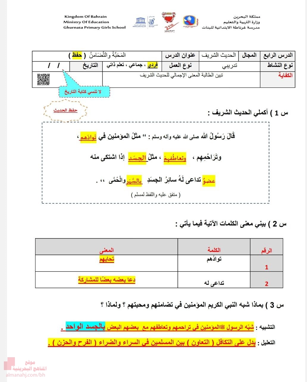 معلومات الملف: هذا النشاط مكمل للملفين السابقين (اللغة الإنجليزية والتربية الإسلامية) ويتبع نفس النمط في التصميم والتقييم. ملخص محتوى الملف: · الحديث النبوي: يركز النشاط على حفظ وفهم حديث "مثل المؤمنين في توادهم وتراحمهم وتعاطفهم، مثل الجسد إذا اشتكى منه عضو تداعى له سائر الجسد بالسهر والحمى" (رواه مسلم). · شرح المفردات: مثل (توادهم، تراحمهم، تعاطفهم، تداعى). · أسئلة الفهم: · التشبيه في الحديث (شبه المؤمنين بالجسد الواحد) وسبب هذا التشبيه (لبيان قوة الترابط والتكافل بين المسلمين). · تعريف مصطلحات المحبة (حب الخير للناس) و التضامن (التعاون ومساعدة بعضنا البعض على فعل الخير). · أنشطة تطبيقية: · ذكر أمثلة على المحبة والتضامن من صور الحياة اليومية (كمساعدة رجل المرور للأطفال في عبور الطريق). · طرح مواقف وتطلب من الطالبة كتابة كيف تتصرف فيها بشكل يعبر عن المحبة والتضامن (مثل مساعدة امرأة مسنة على عبور الطريق، أو إنقاذ طفلة غريقة). · التفكير الناقد: يطلب من الطالبة توضيح الآثار المترتبة على المحبة والتضامن على كل من الفرد (مثل رضا الله، السعادة) و المجتمع (مثل الأمن، الاستقرار، القضاء على الجرائم). · أنشطة مهارات القرن 21: مثل طرح سؤال عن "الدرس المستفاد من الحديث". · نظام التقييم: يحتوي على نفس نظام التقييم الذاتي وتقييم المعلمة الموجود في الملفات السابقة (ممتاز، جيد، متوسط، تحتاج متابعة). الخلاصة: هذا الملف هو الجزء الثالث من مجموعة أنشطة مدرسية متكاملة تتبع منهجًا حديثًا يشجع على: · الفهم و الحفظ. · التطبيق العملي للمفاهيم في الحياة اليومية. · التفكير الناقد وربط الدروس بالقيم والآثار الاجتماعية. · التقييم المستمر والتحفيز على التعلم | ||