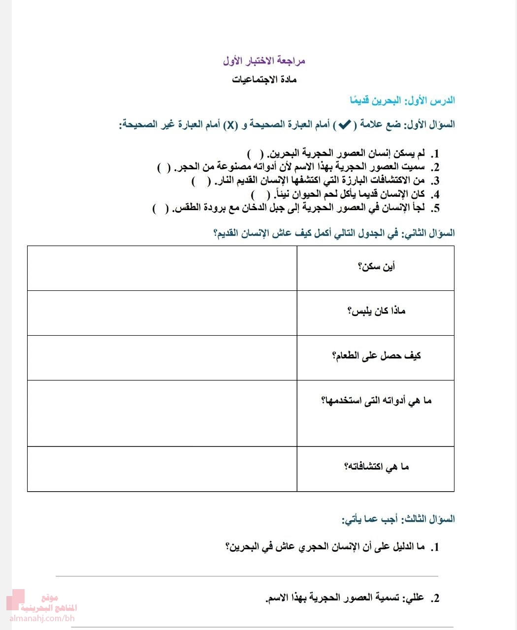 معلومات الملف: هذا الملف هو مراجعة للاختبار الأول في مادة الاجتماعيات، ويركز على التاريخ القديم للبحرين. وهو مقسم إلى ثلاثة دروس رئيسية: --- ???? الدروس الرئيسية: الدرس الأول: البحرين قديمًا (العصور الحجرية) · أسئلة صح وخطأ عن حياة الإنسان في العصور الحجرية. · جدول يلخص حياة الإنسان القديم: المسكن، الملابس، الطعام، الأدوات، الاكتشافات. · أسئلة قصيرة: مثل الدليل على وجود الإنسان الحجري في البحرين، وسبب تسمية العصور الحجرية. الدرس الثاني: البحرين هي دلمون · أسئلة اختيار من متعدد عن الكتابة المسمارية والأختام والمواد التي كُتب عليها. · أنشطة تحديد المهن التي مارسها سكان دلمون (مثل: الزراعة، صيد الأسماك، التجارة). · أسئلة عن وصف دلمون في الكتابات المسمارية (جزيرة تحيط بها المياه). الدرس الثالث: البحرين هي تابلوس ثم أوال · أسئلة صح وخطأ عن الفترة اليونانية والتسميات التاريخية. · أسئلة عن سبب تسمية البحرين بـ "أوال" (نسبة لصنم "أوال" الذي عبدته قبيلة وائل). · ترتيب التسميات التاريخية من الأقدم إلى الأحدث: دلمون → تابلوس → أوال → البحرين. --- ✅ ملاحظات عامة: · الملف يتضمن إجابات نموذجية في الصفحات الأخيرة. · هناك بعض الأخطاء المطبعية البسيطة (مثل: "الحجربية" بدلاً من "الحجرية"، "نياريخوس" بدلاً من "نيارخوس"). · المنهج يركز على التسلسل الزمني والتطور التاريخي للبحرين. | ||