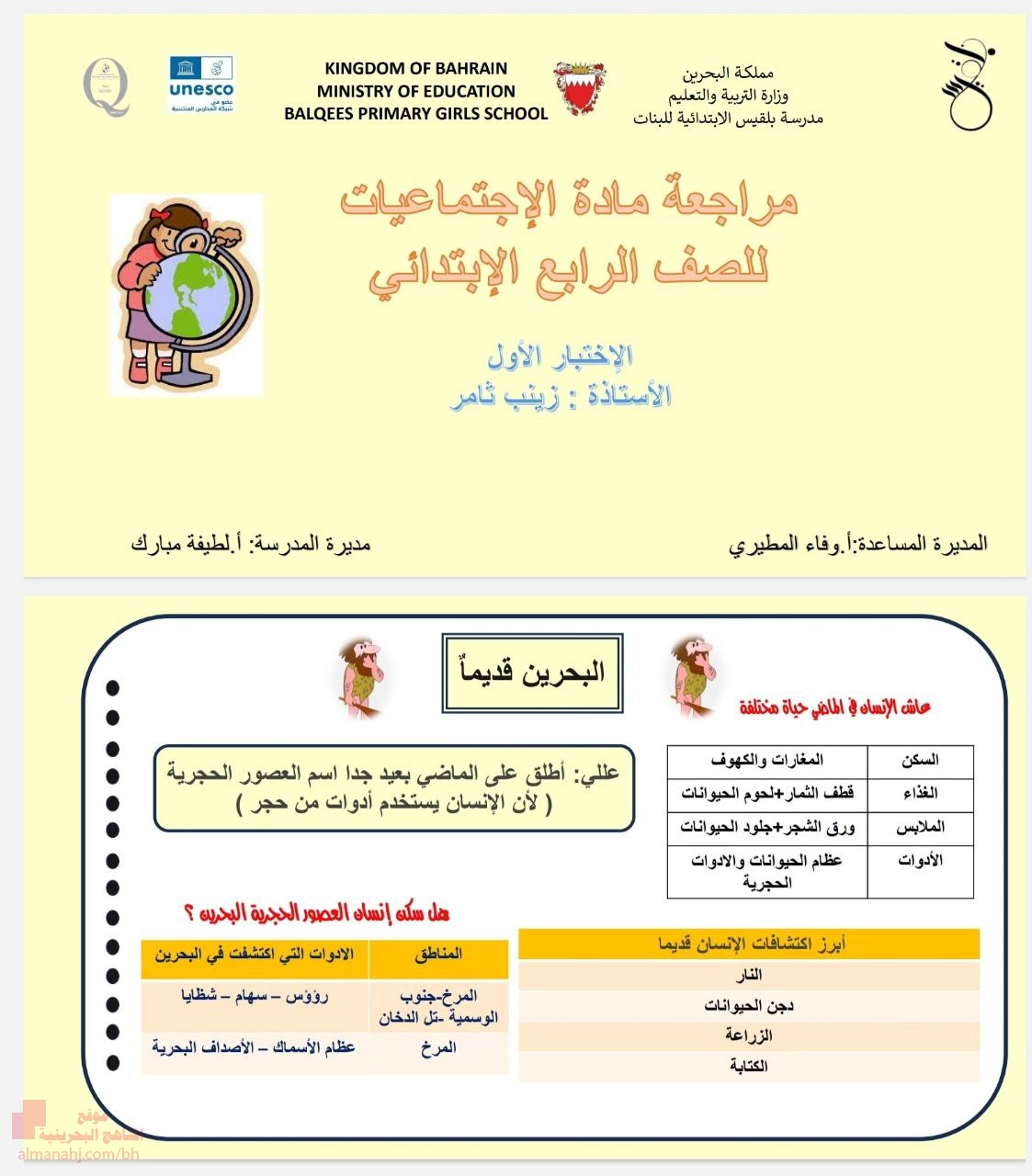 معلومات الملف: هذا الملف هو مراجعة لاختبار الاجتماعيات للصف الرابع الابتدائي في مدرسة بلقيس الابتدائية للبنات، البحرين. وهو يركز على التاريخ القديم للبحرين في ثلاث مراحل رئيسية: --- ???? المراحل التاريخية المغطاة: 1. البحرين قديماً (العصور الحجرية) · سبب التسمية: لأن الإنسان استخدم أدوات من الحجر. · مناطق الاكتشافات الأثرية: · المرخ وجنوب البحرين: رؤوس سهام، شظايا · الوسطى والدخان: عظام أسماك، أصداف بحرية · حياة الإنسان القديم: · السكن: المغارات والكهوف · الغذاء: قطف الثمار، صيد الحيوانات · الملابس: أوراق الشجر، جلد الحيوانات · الأدوات: عظام حيوانات، أدوات حجرية · أبرز الاكتشافات: النار، تدجين الحيوانات، الزراعة، الكتابة 2. البحرين هي دلمون · وصف دلمون: "جزيرة تحيط بها المياه من كل جانب" · اكتشافات أثرية: · حجر مكتوب بالكتابة المسمارية (قصر ريموقاس خادم الإله أنزاك) · قطعة ذهبية منقوش عليها صورة امرأة (قلعة البحرين، 2015) · الكتابة المسمارية: · استخدمت في دلمون وبلاد ما بين النهرين · كتبت على ألواح طين بأقلام من قصب · شكلها يشبه المسامير 3. البحرين هي تابلوس ثم أوال · القبائل العربية: وائل، عبد القيس، تميم · سبب تسمية "أوال": نسبة لصنم "أوال" الذي عبدته قبيلة وائل · الفترة اليونانية: · احتلال الإسكندر المقدوني لبلاد السند، فارس، مصر، إلخ · الحملة البحرية بقيادة نيارخوس · أطلق اليونانيون اسم "تابلوس" على البحرين و"أورادوس" على المحرق --- ???? النشاط المصاحب: · خريطة: تحديد مواقع البلدان والبحار القديمة: · البحر الأحمر، دلمون، فينيقيا، بلاد ما بين النهرين، السند، فارس، مصر، بحر العرب --- ✅ ملاحظات هامة: · المراجعة شاملة ومركزة على الاختبار. · اللغة واضحة ومناسبة للمرحلة الابتدائية. · هناك بعض الأخطاء المطبعية البسيطة. · التركيز على الأسماء التاريخية والأدلة الأثرية. | ||