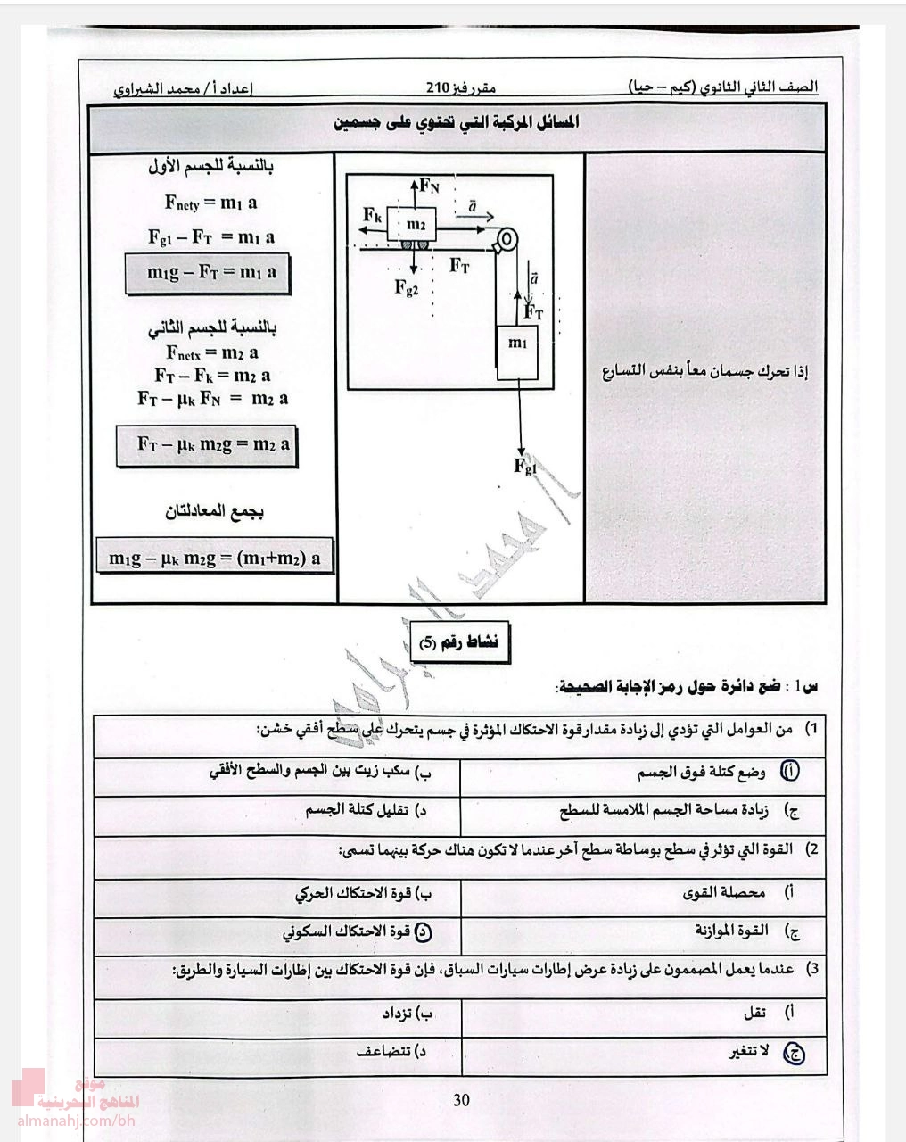 إجابة درس الاحتكاك و الحركة على مستوى مائل, الصف الثاني الثانوي, كيمياء, الفصل الأول, 2025-2026 | ||