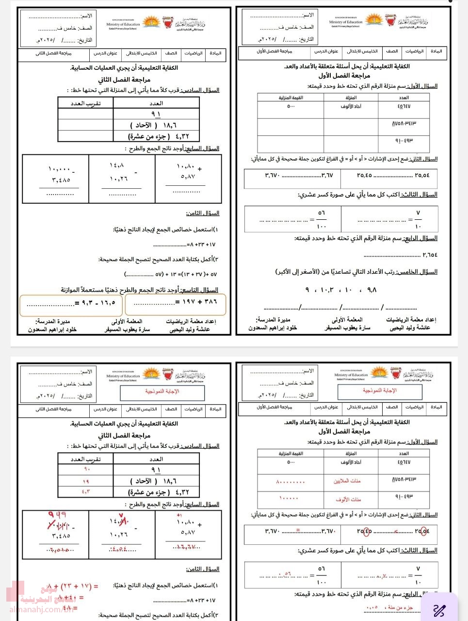 معلومات الملف: هذا المستند هو ورقة مراجعة للرياضيات للصف الخامس الابتدائي، تشمل مراجعة للفصلين الأول والثاني. إليك تحليل المحتوى والتوصيات: --- الملخص العام: · المادة: الرياضيات · الصف: الخامس الابتدائي · الغرض: مراجعة المفاهيم الأساسية في الفصلين الأول والثاني. · المحتوى: يتضمن أسئلة حول: · منزلة الأرقام وقيمتها. · تحويل الكسور إلى كسور عشرية. · ترتيب الأعداد تصاعديًا. · تقريب الأعداد. · عمليات الجمع والطرح. · استخدام خصائص الجمع. · المقارنة بين الأعداد باستخدام الإشارات (<, >, #=). --- الملاحظات على المحتوى: 1. أخطاء طباعية وإملائية مثل: · "الكفاية التعليمية: أن يحيى العمليات الحسابية" – يجب أن تكون "يُجري". · "البرنامجات" – يجب أن تكون "البرامج" أو ربما "المهارات". · "الأسفر" – يجب أن تكون "الأصفر" (ربما مقصود: "الأصغر"). 2. بعض الأرقام والجداول غير مكتملة أو تحتاج إلى تفسير (مثل: tg/ktv، T, Tot). 3. تنسيق الجداول غير منتظم، مما قد يصعب على الطالب فهم المطلوب. --- التوصيات: 1. مراجعة النص وتصحيح الأخطاء الإملائية والنحوية. 2. تنسيق الجداول بشكل أوضح وضمان اكتمال البيانات. 3. توضيح التعليمات لكل سؤال لمساعدة الطالب على فهم المطلوب بدقة. 4. إرفاق إجابات نموذجية للأسئلة لتمكين الطالب من المراجعة الذاتية. --- ملاحظة إضافية: يبدو أن المستند من إعداد معلمة الرياضيات عائشة وليد اليحيى، وتمت المراجعة من قبل مديرة المدرسة خلود إبراهيم السعدون والمعلمة الأولى سارة يعقوب المسيفر. يُنصح بمراجعة النموذج قبل استخدامه في الفصل لضمان الدقة والوضوح. | ||