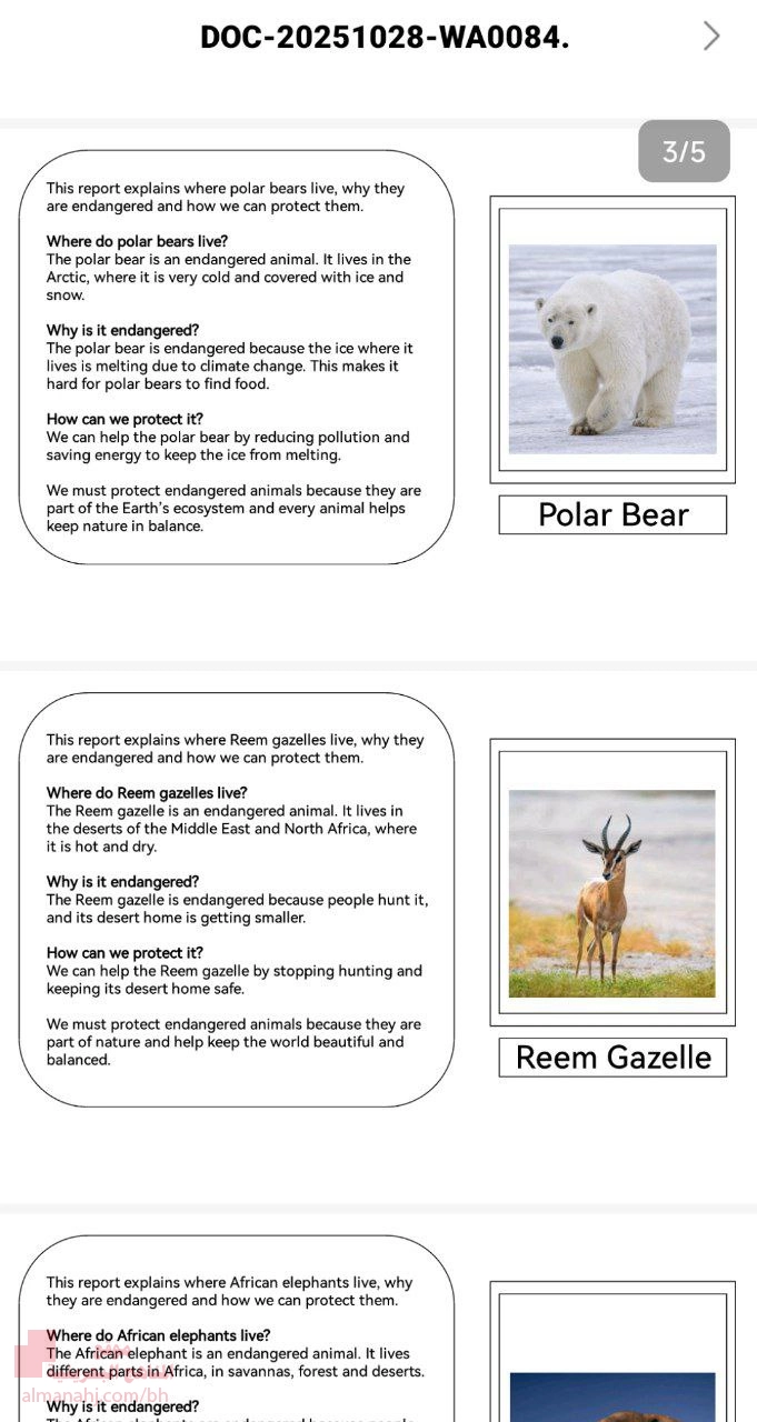 معلومات الملف: تحليل المحتوى العلمي والموضوعي الموضوع الرئيسي: الحيوانات المهددة بالانقراض. الحيوانات المشمولة:الباندا العملاقة، سلحفاة البحر، الدب القطبي، غزال الريم، الفيل الأفريقي. هيكل كل تقرير: يتبع كل تقرير هيكلاً موحداً ومتسقاً، مما يسهل على المتعلم فهم النمط واستيعاب المعلومات. ينقسم كل تقرير إلى: 1. المقدمة: تقديم الحيوان والإشارة إلى أنه مهدد بالانقراض. 2. الموطن: وصف بيئة الحيوان الطبيعية. 3. أسباب الانقراض: ذكر الأخطار الرئيسية التي تهدد الحيوان (مثل فقدان الموطن، الصيد، التلوث، تغير المناخ). 4. طرق الحماية: اقتراح حلول وإجراءات عملية للمساعدة في حماية الحيوان. 5. الخاتمة: التأكيد على أهمية حماية الحيوانات للحفاظ على التوازن البيئي. ثانياً: الأهداف التربوية والتعليمية من خلال هذا المحتوى، يمكن تحقيق مجموعة من الأهداف التربوية والتعليمية: أ. الأهداف المعرفية (المعرفة والفهم): 1. التعرف: أن يتعرف الطالب على أسماء خمسة حيوانات مهددة بالانقراض. 2. الفهم: أن يفهم الطالب المعنى الأساسي لمصطلح "حيوان مهدد بالانقراض". 3. الربط: أن يربط الطالب بين سلوكيات الإنسان (مثل قطع الأشجار، الصيد، إنتاج النفايات البلاستيكية) والتهديدات التي تواجه هذه الحيوانات. 4. الاستدلال: أن يستنتج الطالب العلاقة بين بيئة الحيوان وتكيفه معها (مثل الدب القطبي والجليد). ب. الأهداف المهارية (المهارات): 1. مهارات القراءة: تنمية مهارة الفهم الاستيعابي من خلال نصوص مترابطة وواضحة. 2. مهارات التفكير: تطوير مهارة التفكير الناقد من خلال تحليل أسباب المشكلة (الانقراض) والبحث عن حلول. 3. مهارات البحث: يمكن استخدام هذه التقارير كنقطة انطلاق لبحوث بسيطة يقوم بها الطالب حول حيوان آخر. 4. مهارات العرض والتقديم: تدريب الطالب على تنظيم المعلومات وعرضها بطريقة منطقية (حسب الهيكل المتبع). ج. الأهداف الوجدانية (القيم والمشاعر): 1. تعزيز الوعي البيئي: غرس أهمية الحفاظ على البيئة والتنوع الحيوي لدى الطالب. 2. تنمية حس المسؤولية: جعل الطالب يشعر بأنه جزء من الحل ويمكنه المساعدة من خلال سلوكياته اليومية (كترشيد الطاقة وتقليل استخدام البلاستيك). 3. تعزيز التعاطف: تنمية مشاعر الرأفة والاهتمام بالكائنات الحية الأخرى. 4. الإدراك العالمي: مساعدة الطالب على فهم أن المشاكل البيئية (كالتغير المناخي) هي مشاكل عالمية تتطلب تعاوناً دولياً. ثالثاً: طرائق التدريس والأنشطة المقترحة يمكن استخدام هذا الملف كأساس لتطبيق مجموعة متنوعة من استراتيجيات وطرائق التدريس: 1. طريقة التعلم التعاوني: · النشاط: تقسيم الطلاب إلى مجموعات، وكل مجموعة تختار حيواناً مختلفاً. تقوم كل مجموعة بدراسة التقرير الخاص بحيوانها، ثم تقدمه لباقي الزملاء في شكل عرض تقديمي أو ملصق (بوستر). يشجع هذا على العمل الجماعي وتبادل المعرفة. 2. طريقة حل المشكلات: · النشاط: عرض "مشكلة" انقراض أحد الحيوانات، ثم توجيه الطلاب (أفراداً أو جماعات) للبحث عن أسباب هذه المشكلة (بناءً على التقرير) واقتراح خطة عمل مفصلة للحماية تتجاوز النقاط المذكورة. هذا ينمي التفكير الإبداعي والناقد. 3. التعلم القائم على المشاريع: · النشاط: مشروع "حملة التوعية بحيواني المهدد". يقوم الطلاب بإنشاء ملصقات توعوية، أو مقاطع فيديو قصيرة، أو منشورات على وسائل التواصل الاجتماعي (افتراضياً) لتثقيف الآخرين حول الحيوان الذي قاموا بدراسته، مستخدمين المعلومات الواردة في التقارير. 4. المناقشة والحوار: · الأسئلة المحفزة: يمكن للمعلم طرح أسئلة مثل: · "لماذا تعتقد أن حماية الحيوانات المهددة مهمة لنا حتى لو كنا لا نعيش في نفس المكان؟" · "أي من الحلول المقترحة تعتقد أنه الأكثر فعالية؟ ولماذا؟" · "ما هي التحديات التي قد نواجهها عند تطبيق هذه الحلول؟" 5. التعلم باللعب / الدراما: · النشاط: تمثيل أدوار، حيث يلعب أحد الطلاب دور حيوان مهدد، وآخر دور صياد، وآخر دور عالم بيئة، وآخر دور سائح. ثم يتم محاورة كل شخصية لفهم وجهات النظر