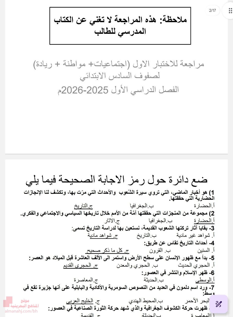 تم إيجاد الملف: مراجعة الاختبار الأول في المواد الاجتماعية و الريادة و التربية للمواطنة