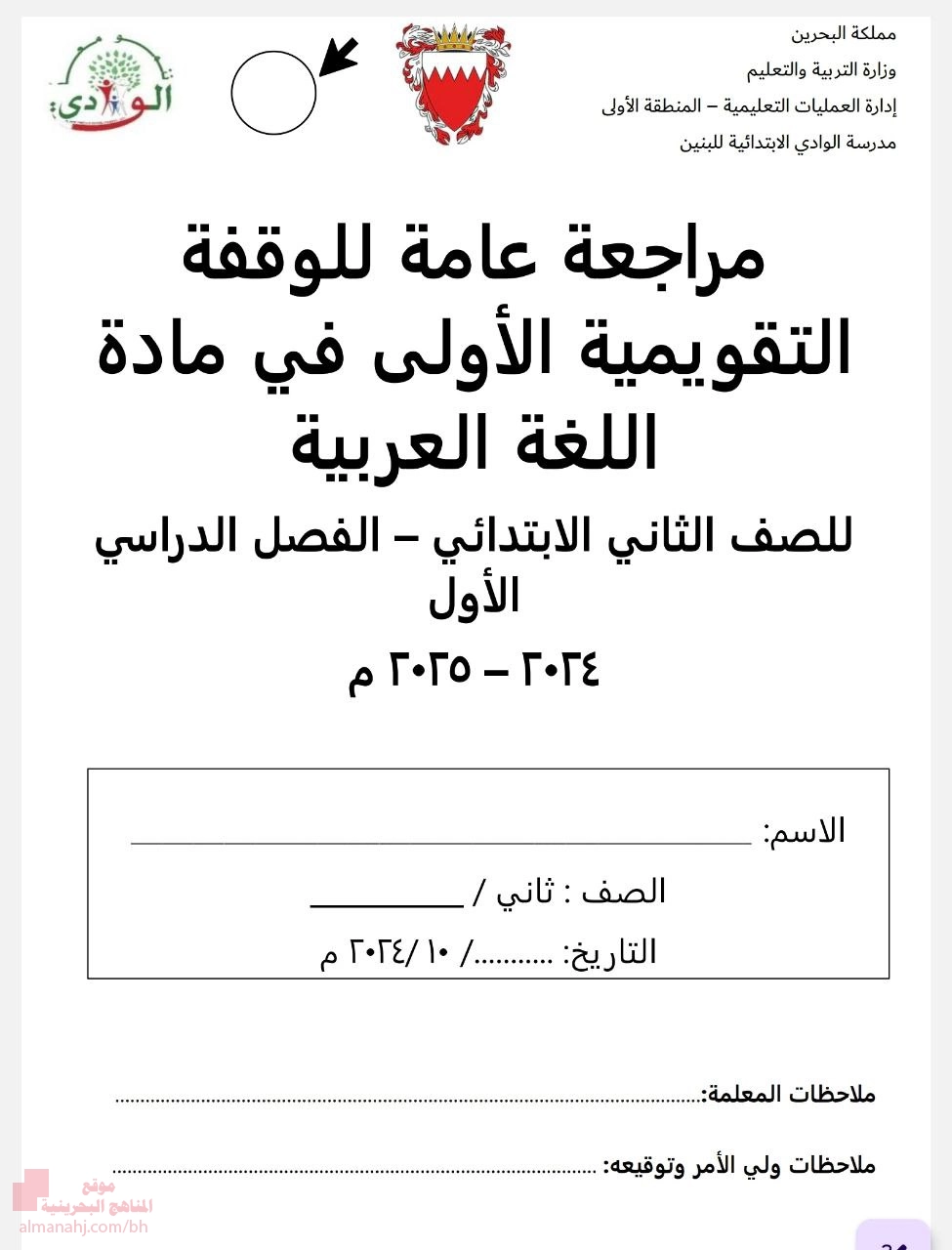 مراجعة الوقفة التقويمية الأولى في اللغة العربية الاختبار الأول, الصف الثاني, لغة عربية, الفصل الثاني, 2025-2026 - المناهج البحرينية