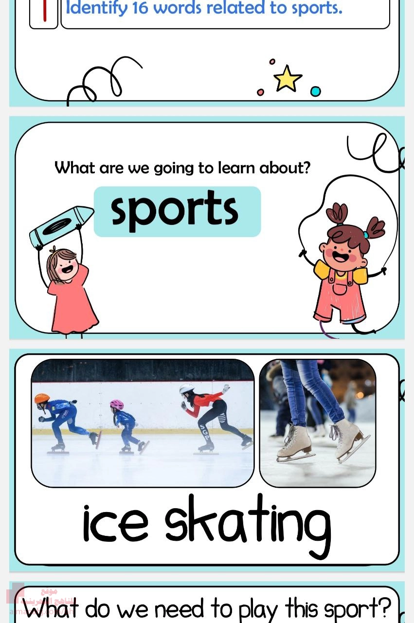 معلومات الملف: 1. العنوان: الوحدة الرابعة - الرياضة للجميع - درس المفردات. 2. الهدف: تمكين الطالب من التعرف على 16 كلمة متعلقة بالرياضات. 3. الرياضات المغطاة: التزلج على الجليد، ركوب الدراجات، التزلج على اللوح، الغطس، الجمباز، الكرة الطائرة، الإبحار، التجديف، الجولف، ألعاب القوى. 4. هيكل كل رياضة: يتم تقديم كل رياضة مع متطلباتها الأساسية (المعدات والملعب). 5. الربط المحلي: يربط الدرس الرياضات بمدينة البحرين (مثل أماكن التزلج في المجمعات). 6. المنطق والسببية: يطرح أسئلة مثل "هل يمكن ممارسة هذه الرياضة في البحرين؟" ويطلب الأسباب (مثل الحاجة للثلج أو الجبال). 7. المشاعر: يعرض مشاعر الرياضيين مثل السعادة لفوزهم بميدالية ذهبية أو الحزن due to الخسارة. 8. التقييم: ينتهي الدرس بنشاط تفاعلي عبر منصة Wordwall الإلكترونية للاختبار واللعب. 9. المنهجية: يعتمد على تقديم مفردات جديدة من خلال الصور والمواقف الواقعية. 10. التكامل: يدمج بين تعلم اللغة وتطوير الوعي الثقافي حول الرياضات المختلفة وإمكانية ممارستها محلياً. 11. المهارات: ينمي مفردات الطالب ومهارات التفكير المنطقي والربط بين المفاهيم. 12. التفاعل: يشجع على المشاركة النشطة من خلال الأسئلة والمناقشات واللعبة الختامية. 13. التصميم: يستخدم شرائح بسيطة وواضحة مع صور توضيحية لكل رياضة. 14. التركيز: يركز على الجانب العملي للكلمات وكيفية استخدامها في سياق حقيقي. 15. الختام: يهدف إلى جعل تعلم المفردات تجربة ممتعة وذات معنى للطلاب. | ||
