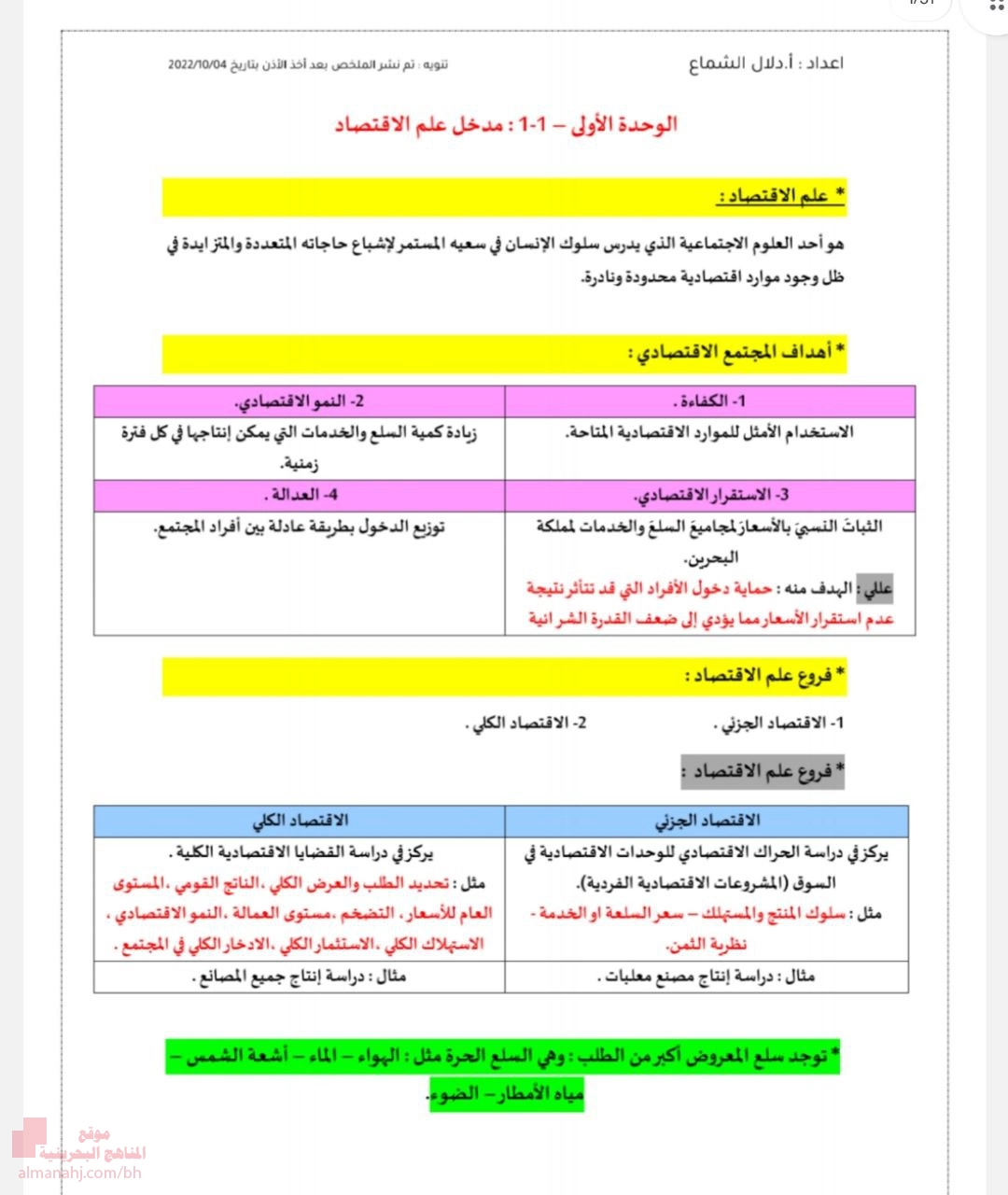 معلومات الملف: تم إعداد هذا الملخص الشامل لمادة الاقتصاد من قبل أ. دلال الشماع. يغطي الملخص خمس وحدات رئيسية تبدأ بالمدخل إلى علم الاقتصاد وأهدافه المجتمعية وفروعه الكلي والجزئي. يتناول المفاهيم الأساسية مثل السلع والخدمات وأنواع الأسواق والمشكلة الاقتصادية وطرق حلها. يشرح النشاط الاقتصادي في البحرين وعوامل الإنتاج وعوائدها وإدارة الجودة الشاملة. يغطي العمل والكسب المشروع وحسابات القوى العاملة والبطالة والدخل النقدي والحقيقي. يناقش الاستهلاك والإدخار والرؤية الاقتصادية 2030 والتنوع الاقتصادي والاستثمار في البحرين. يختتم بالريادة وتمويل المشاريع والقطاع المالي من بنوك وتأمين ونقل وتخزين. | |||