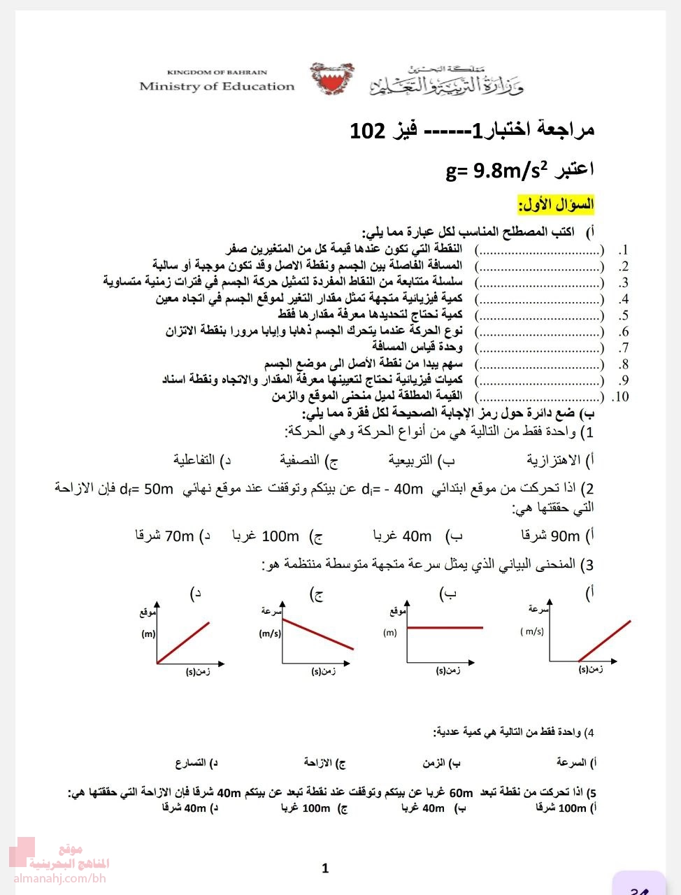 تم إيجاد الملف: مراجعة الاختبار الأول في مقرر الفيز 102