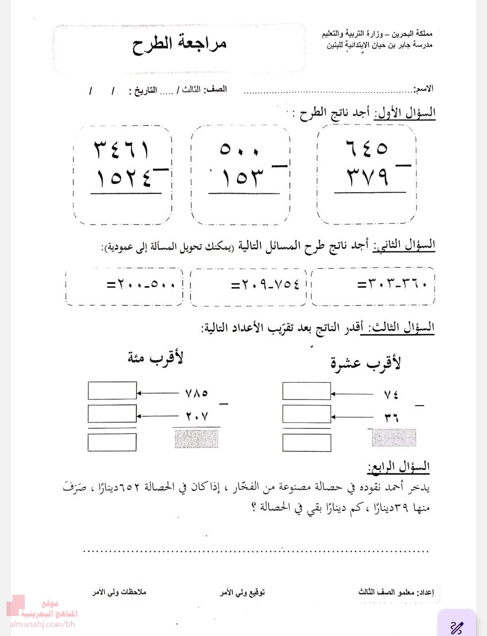 7. الصف الثالث, رياضيات, مراجعة درس الطرح