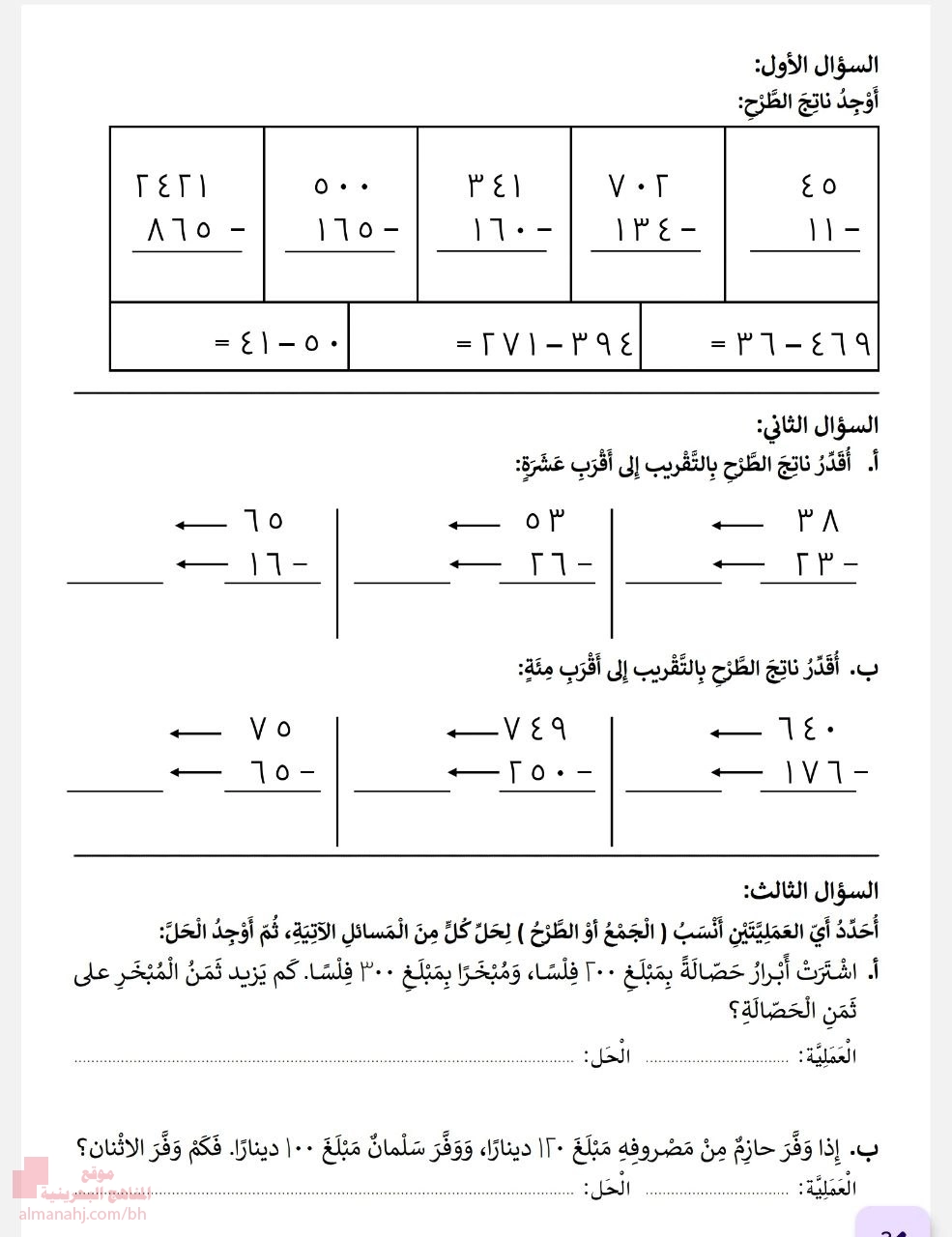 1. أنشطة الطرح للصف الثالث الابتدائي