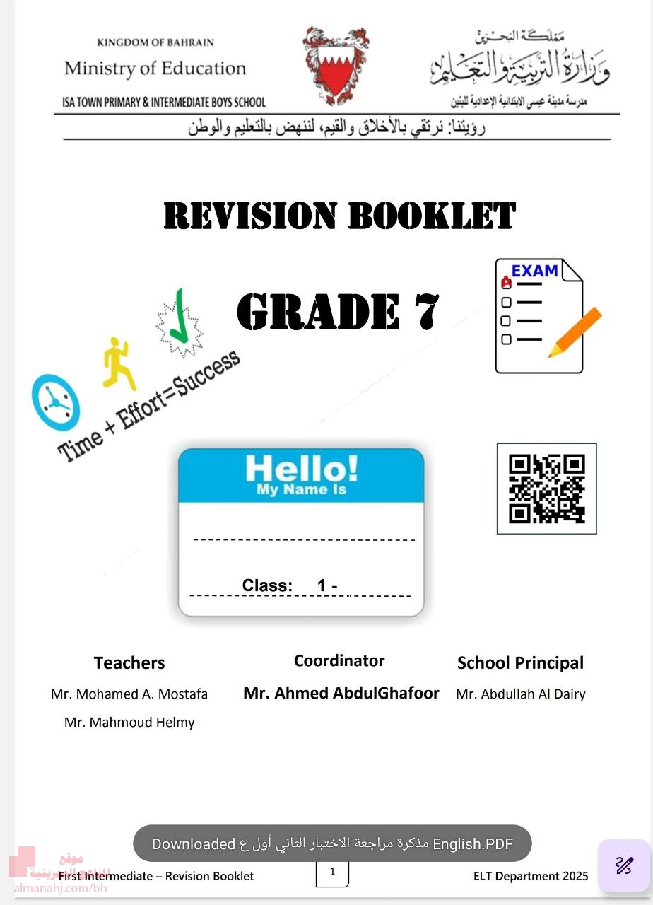 معلومات الملف: مملكة البحرين - مدرسة مدينة عيسى كراسة مراجعة اللغة الإنجليزية للصف السابع - الوحدة الثانية المفردات: · وظائف غير اعتيادية: مستكشف، باحث، عالم آثار، مصور. · تمارين تصنيف الكلمات ومطابقة الوظائف مع المهام. القواعد: · تكوين الأسئلة باستخدام: What, Where, When, Who, How. · الملكية: 's للضمائر والأسماء. · الضمائر الملكية: my, your, his, her, its, our, their. القراءة: · نص عن عالم الآثار "دانيال" وعمله في أماكن خطيرة ومثيرة. · أسئلة لفهم الفقرات واستخراج المعلومات. الكتابة: · كتابة فقرة وصفيّة (100-120 كلمة) عن وظيفة غير اعتيادية. · هيكل الفقرة: عنوان، جملة موضوع، تفاصيل، جملة ختامية. · نماذج كتابة: غواص، مصور تحت الماء، مختبر طعام. الإجابات النموذجية: · متضمنة حلول جميع التمارين والأنشطة. المراجعة تركّز على الوظائف المثيرة ومهارات الكتابة الوصفية. | ||