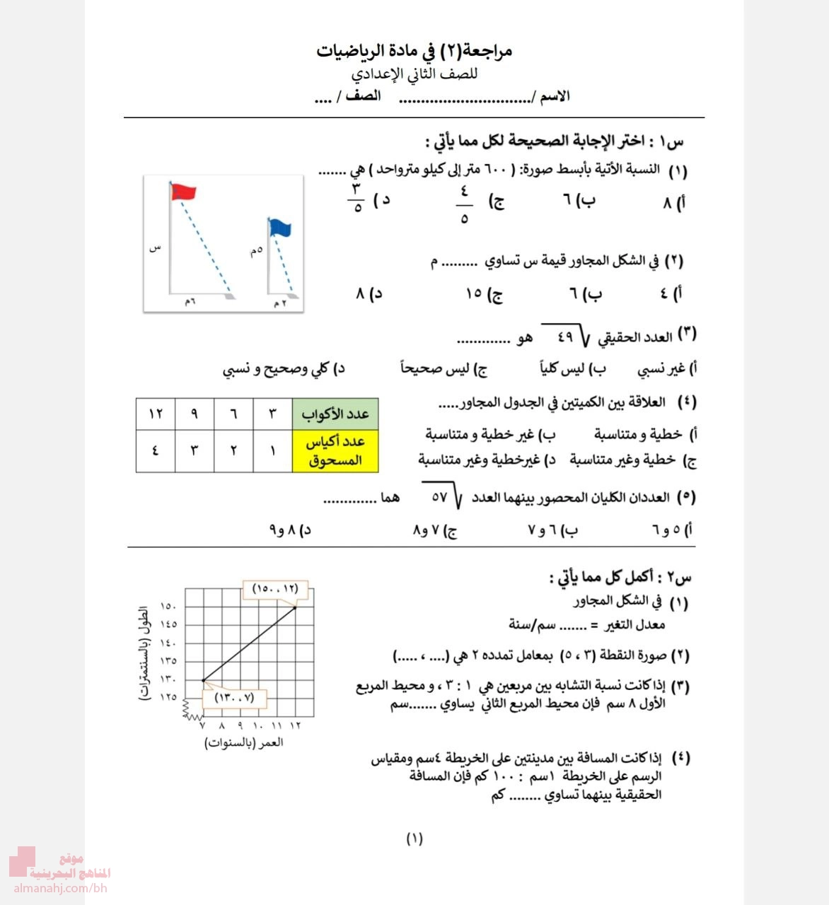 4. الصف الثامن, رياضيات, مراجعة الاختبار الثاني في الرياضيات