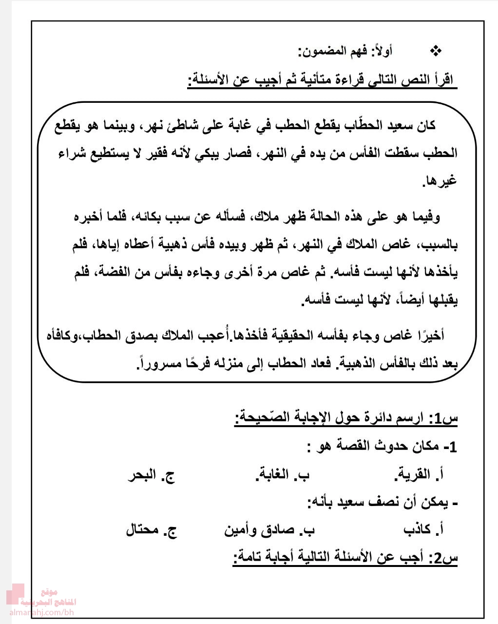 1. القسم الأول: فهم النص الأدبي (قصة الحطاب سعيد)