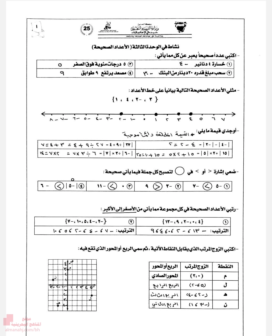 5. الصف السابع, رياضيات, حل أسئلة مراجعة الاختبار الثاني في الرياضيات