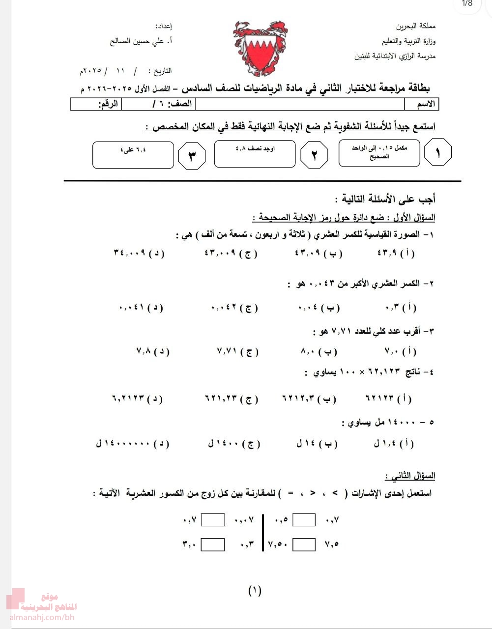 1. الصف السادس, رياضيات, مراجعة الاختبار الثاني في مادة الرياضيات المراجعة الشاملة