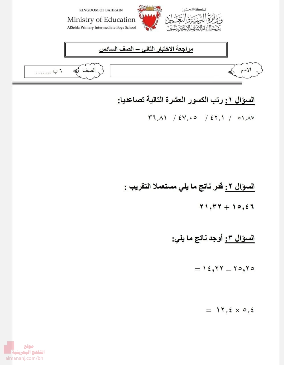 | أنت هنا: موقع المناهج ⇦ المناهج البحرينية ⇦ الصف السادس ⇦ رياضيات ⇦ الفصل الأول ⇦ اختبارات |
