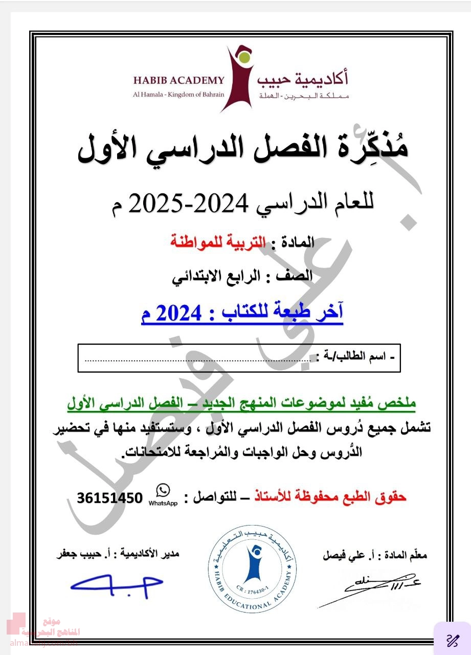 مذكرة التربية للمواطنة للصف الرابع الفصل الأول