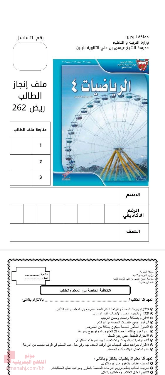 8. الصف الثاني الثانوي, رياضيات, ملف انجاز الطالب مقرر ريض 262 أنشطة 2024-2025م