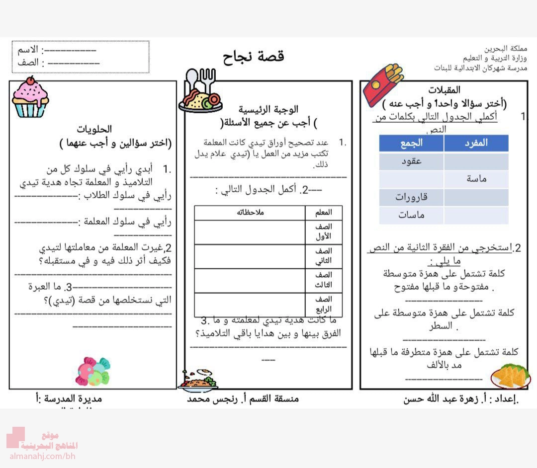 نشاط تفاعلي لقصة نجاح, زهرة عبدالله حسن, الصف الرابع, لغة عربية, الفصل الثاني, 2025/2026 - المناهج البحرينية