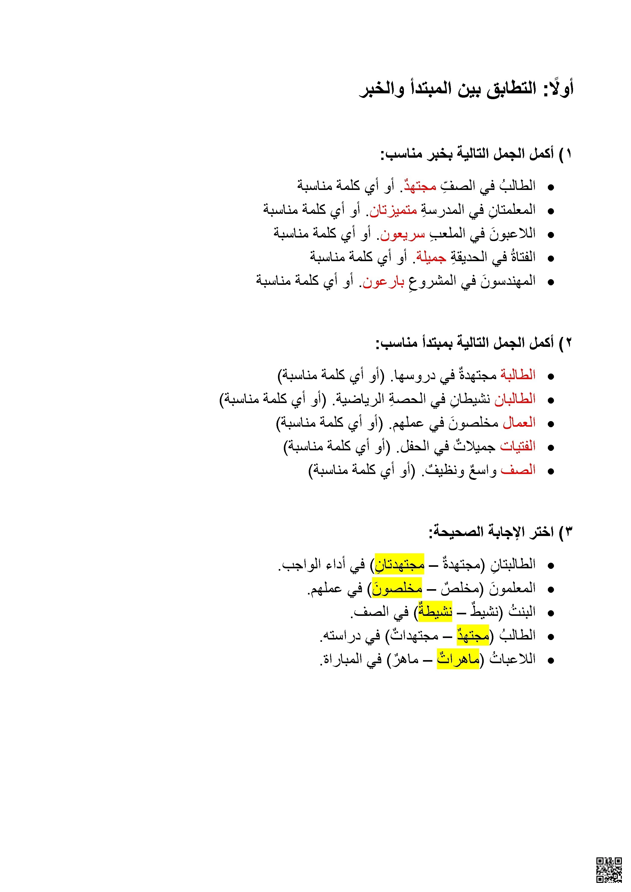 يغطي هذا الملف مواضيع نحوية أساسية وهي: المبتدأ والخبر مع وجوب التطابق بينهما في النوع والعدد، وأخوات كان وإنّ وأثرهما في الجملة الاسمية، بالإضافة إلى التمييز بين النكرة والمعرفة وطرق التحويل بينهما باستخدام (أل) التعريف، وأخيراً قواعد كتابة الهمزة المتطرفة وفقاً لحركة الحرف الذي يسبقها.