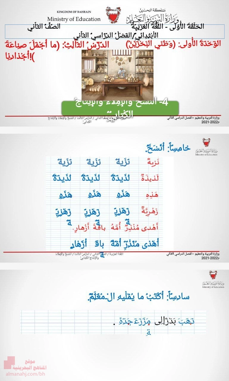 الوحدة الأولى وطني البحرين الدرس الثالث ما أجمل صناعة أجدادنا النسخ والإملاء