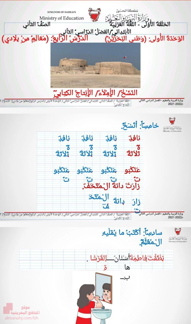 الوحدة الأولى وطني البحرين الدرس الرابع معالم من بلادي النسخ والإملاء