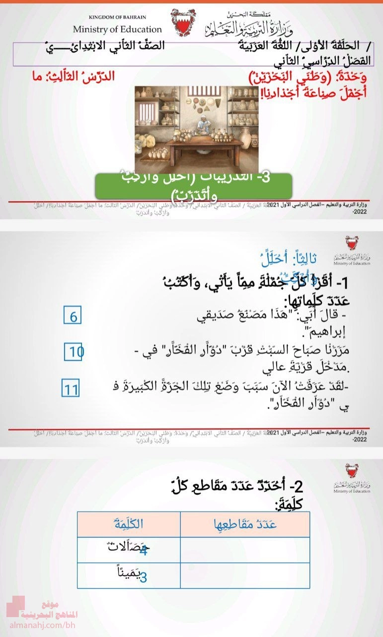 الوحدة الأولى وطني البحرين الدرس الثالث ما أجمل صناعة أجدادنا أحلل وأركب بحسب الصف الثاني في مادة اللغة العربية – الفصل الثاني