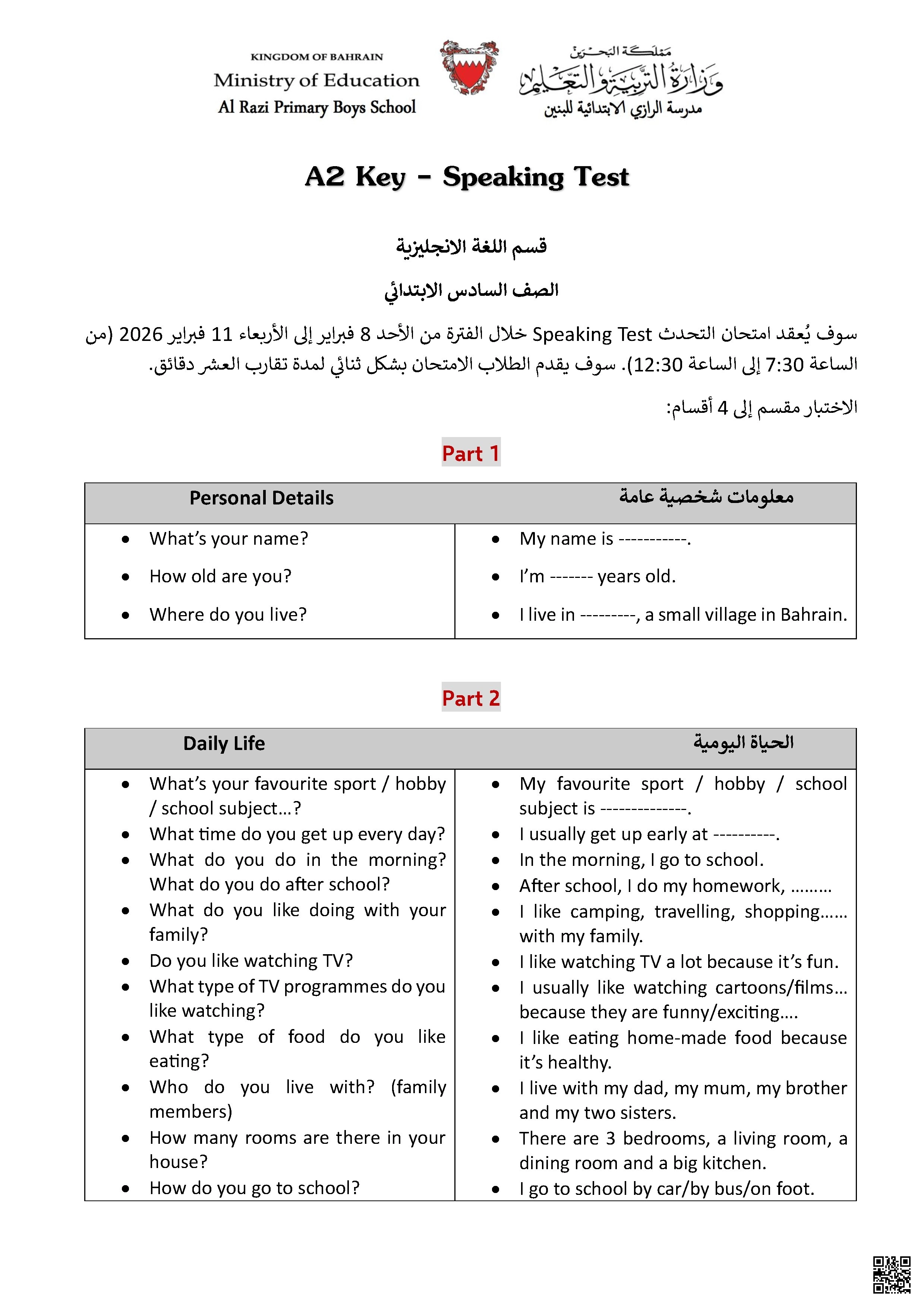 دليل اختبار التحدث A2 Key بحسب الصف السادس في مادة اللغة الإنجليزية – الفصل الثاني