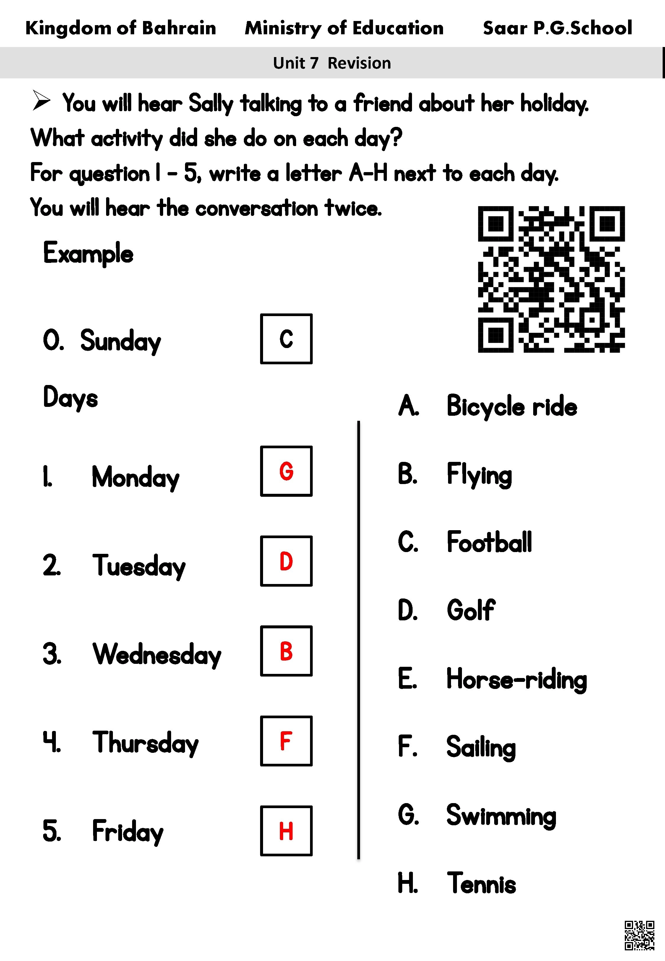 يحتوي هذا الملف على إجابات نموذجية لاختبار الاستماع (مطابقة الأيام بالأنشطة كركوب الدراجات، الطيران، كرة القدم، الغولف، ركوب الخيل، الإبحار، السباحة، التنس) وأسئلة الاختيار من متعدد (ماذا ستفعل المرأة في الحديقة، ماذا كان الرجل يفعل عندما كسر ساقه، ماذا فقدت المرأة، أين سيكتب الرجل مقاله، متى تبدأ الحفلة).