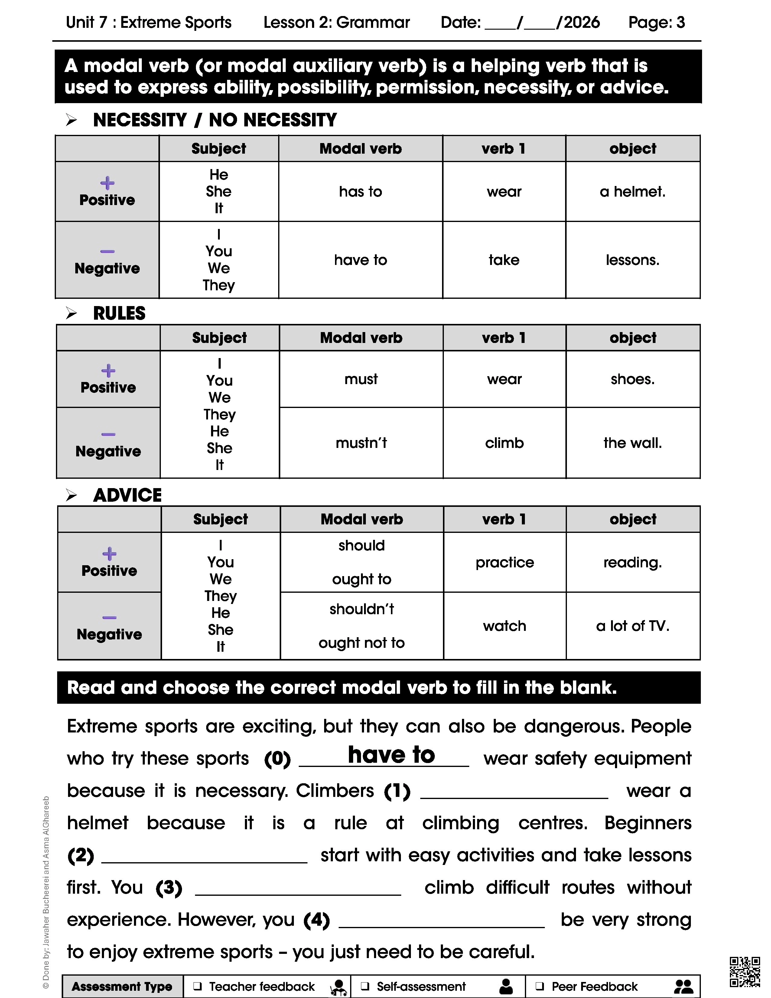 يغطي هذا الملف شرح الأفعال الناقصة (modal verbs) حسب الاستخدام: necessity (has to/have to)، rules (must/mustn&039;t)، advice (should/ought to/shouldn&039;t/ought not to)، مع تمارين اختيار الإجابة الصحيحة (يجب على المتسلقين ارتداء خوذة، على المبتدئين البدء بأنشطة سهلة، لا يجب تسلق طرق صعبة دون خبرة).