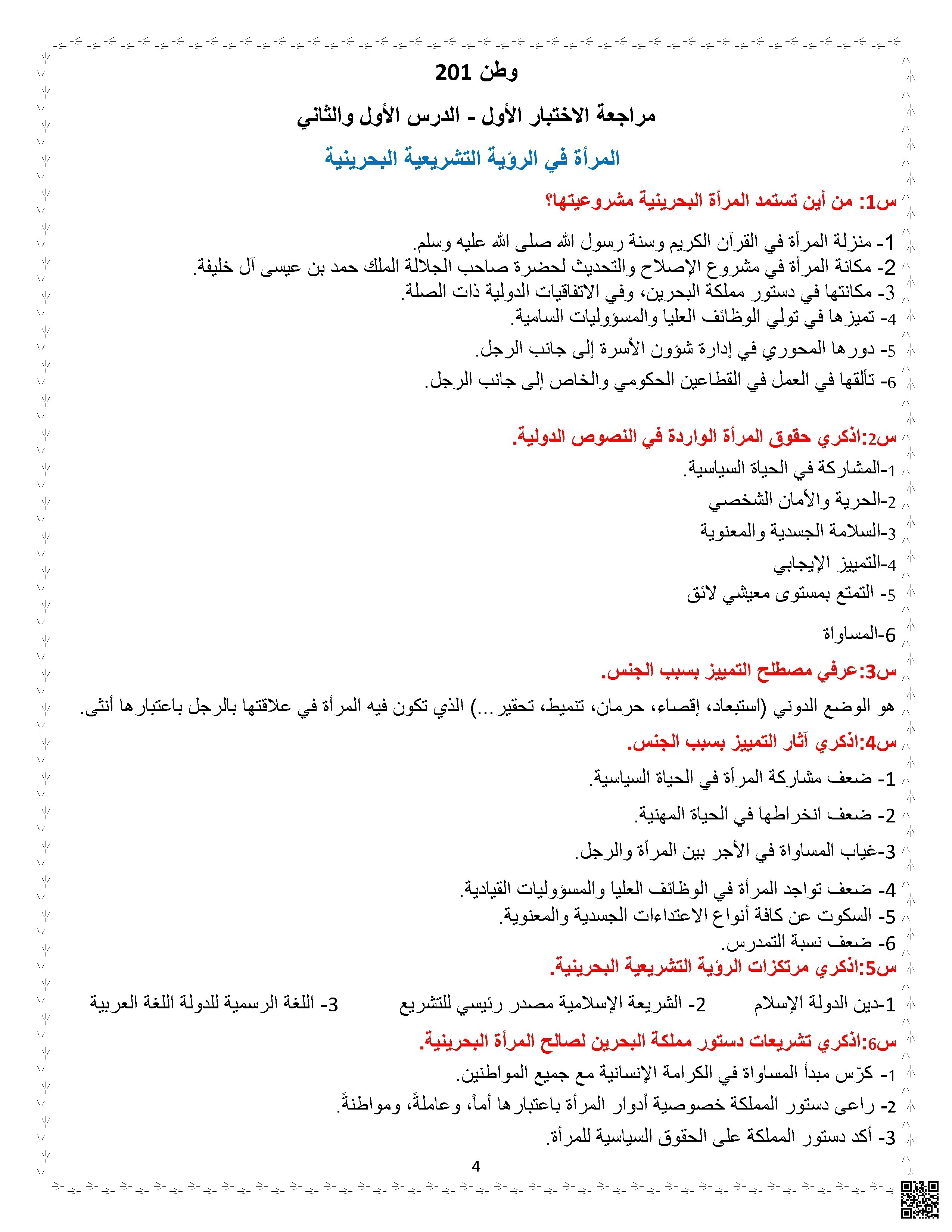 مراجعة الاختبار الأول الدرس الأول والثاني في وطن 201 المرأة والطفل في الرؤية التشريعية البحرينية