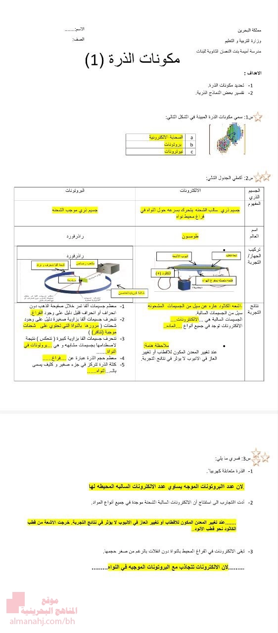 معلومات الملف: نضع بين أيديكم ملفاً بعنوان شرح مكونات الذرة للصف الأوّل الثانوي،وتتجلى قيمة الملف وأهميته في تعريف الطالب على مكونات الذرة ، وذلك وفق منهاج مملكة البحرين.