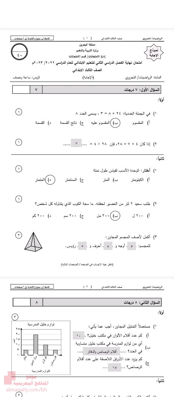إجابة الامتحان التحريري لنهاية الفصل 2022-2023م, الصف الثالث, رياضيات, الفصل الثاني, 2023/2024 - المناهج البحرينية