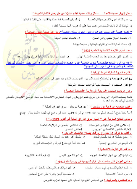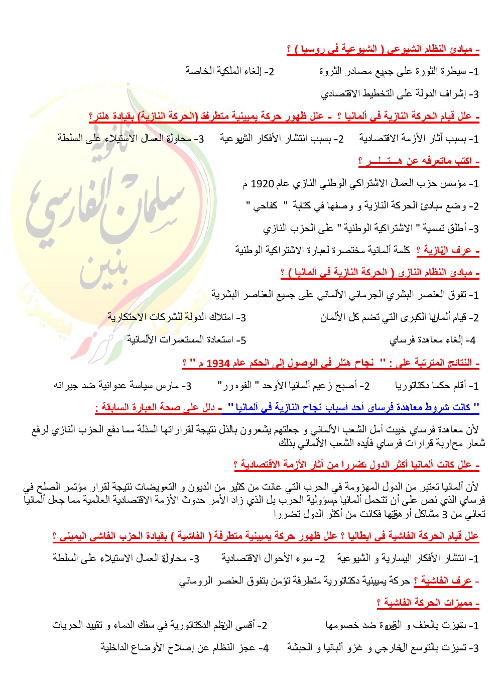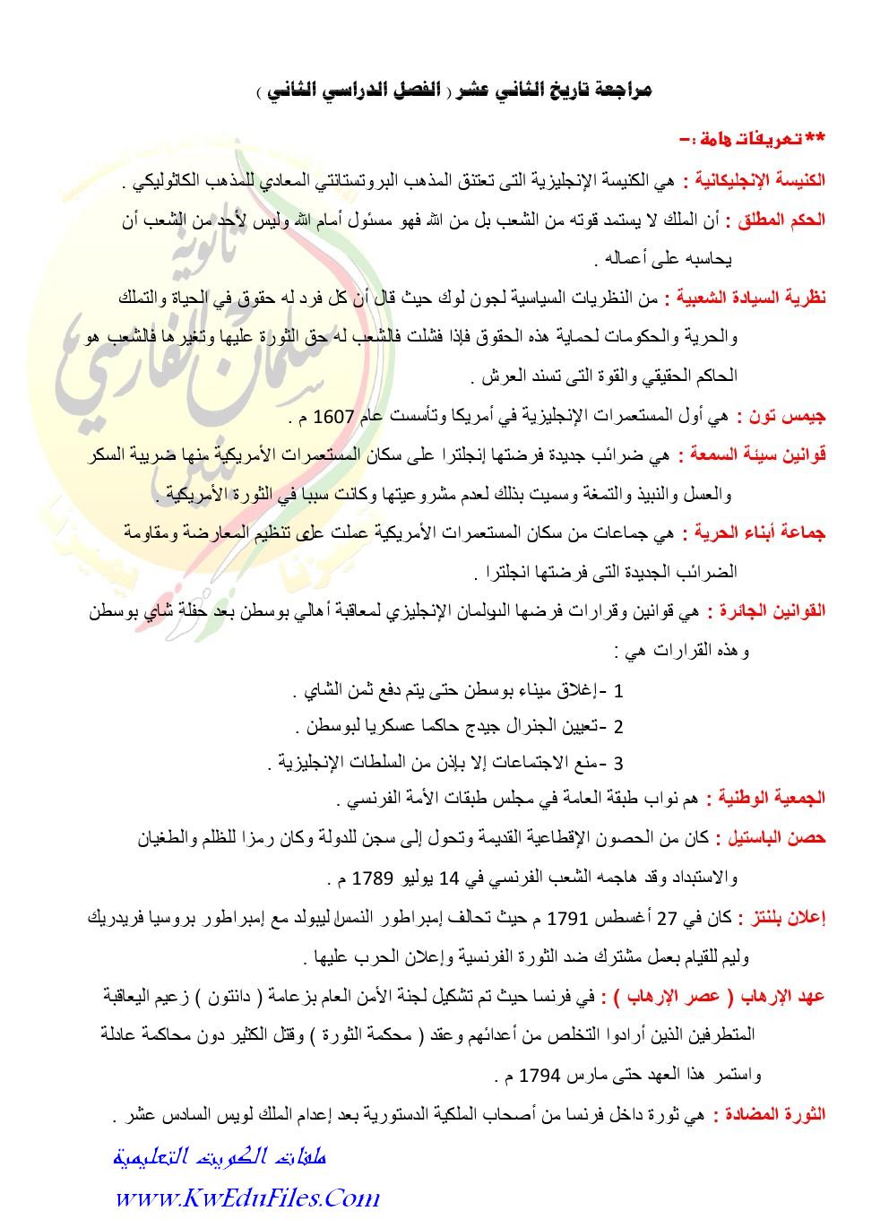 18 ورقة في مادة التاريخ للصف الثاني عشر الادبي للفصل الدراسي الثاني تتضمن مراجعات مهمة