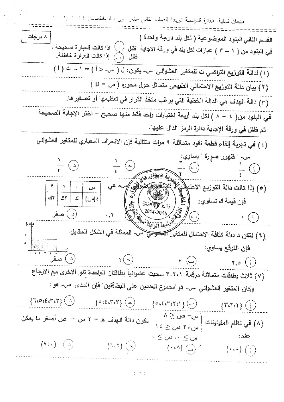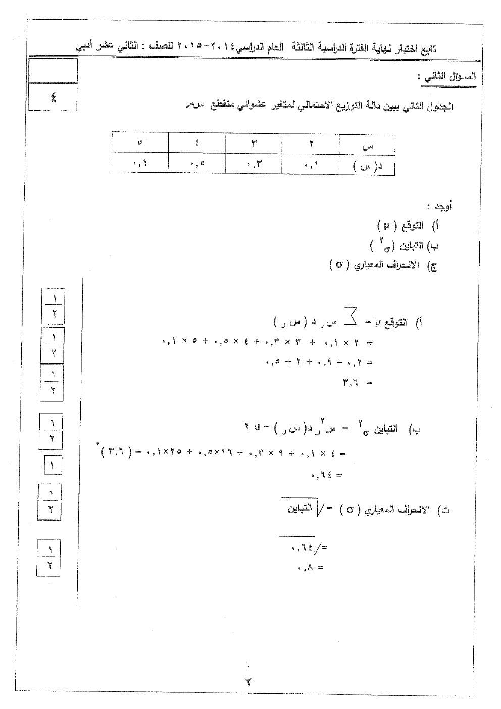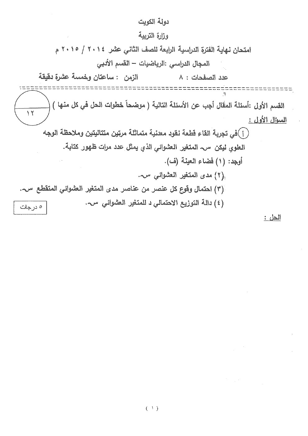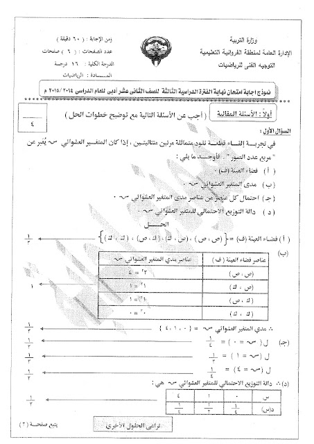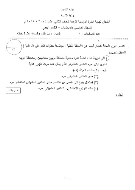 نماذج اختبارات واجاباتها النموذجية في مادة الاحصاء, ثانوية سلمان الفارسي, الصف الثاني عشر الأدبي, إحصاء, الفصل الثاني, 2017-2018 - المناهج الكويتية