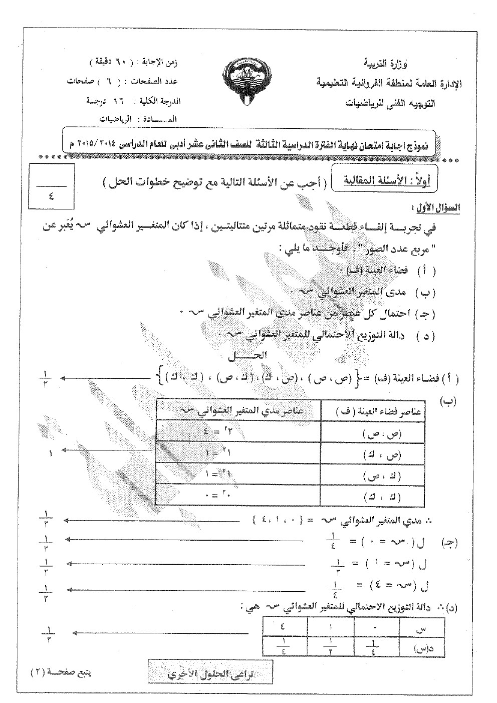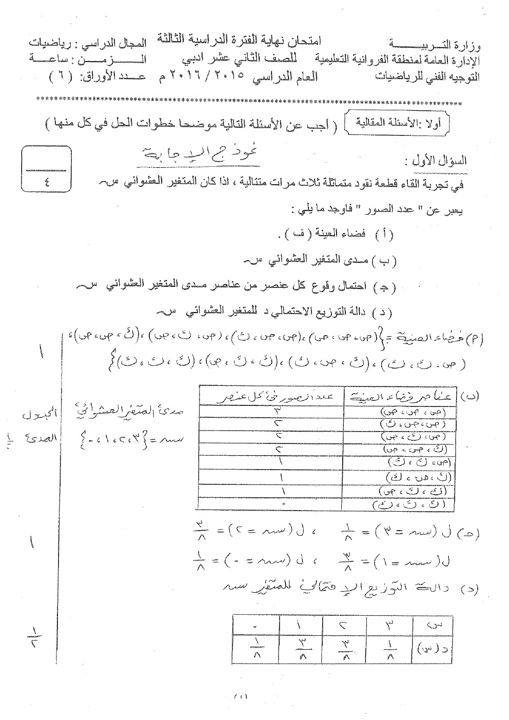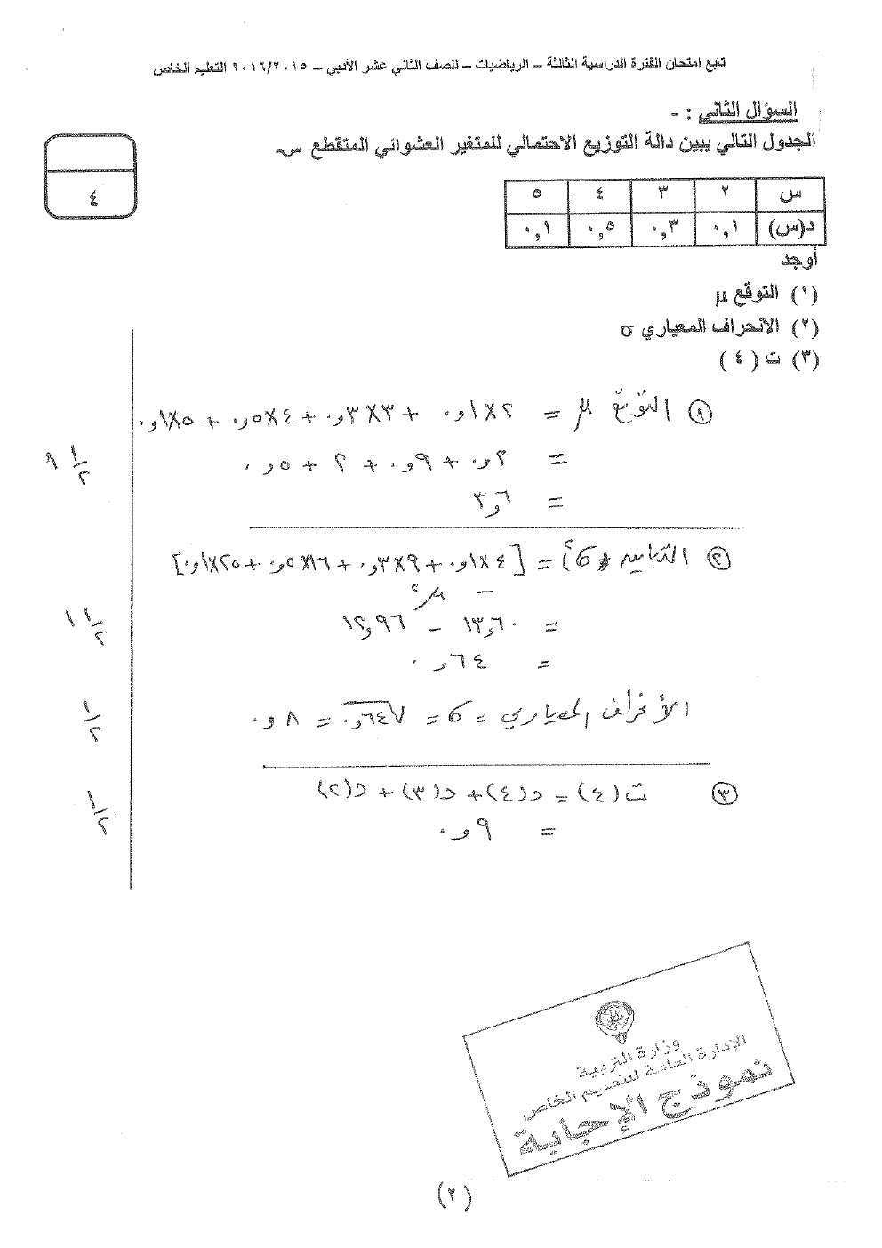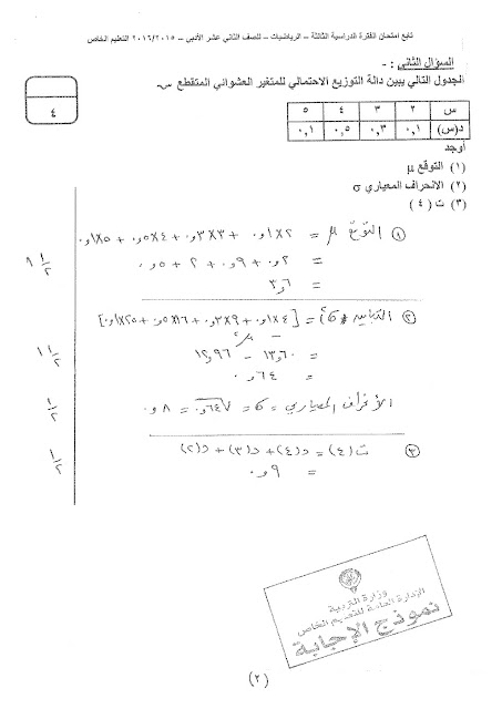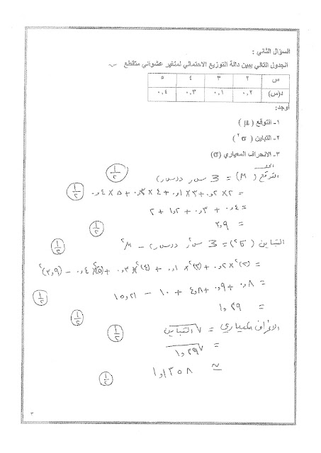 8. إحصاء, الفصل الثاني, 2025-2026, نموذج إجابة الاختبار النهائي الرسمي المعتمد من التوجيه الفني العام